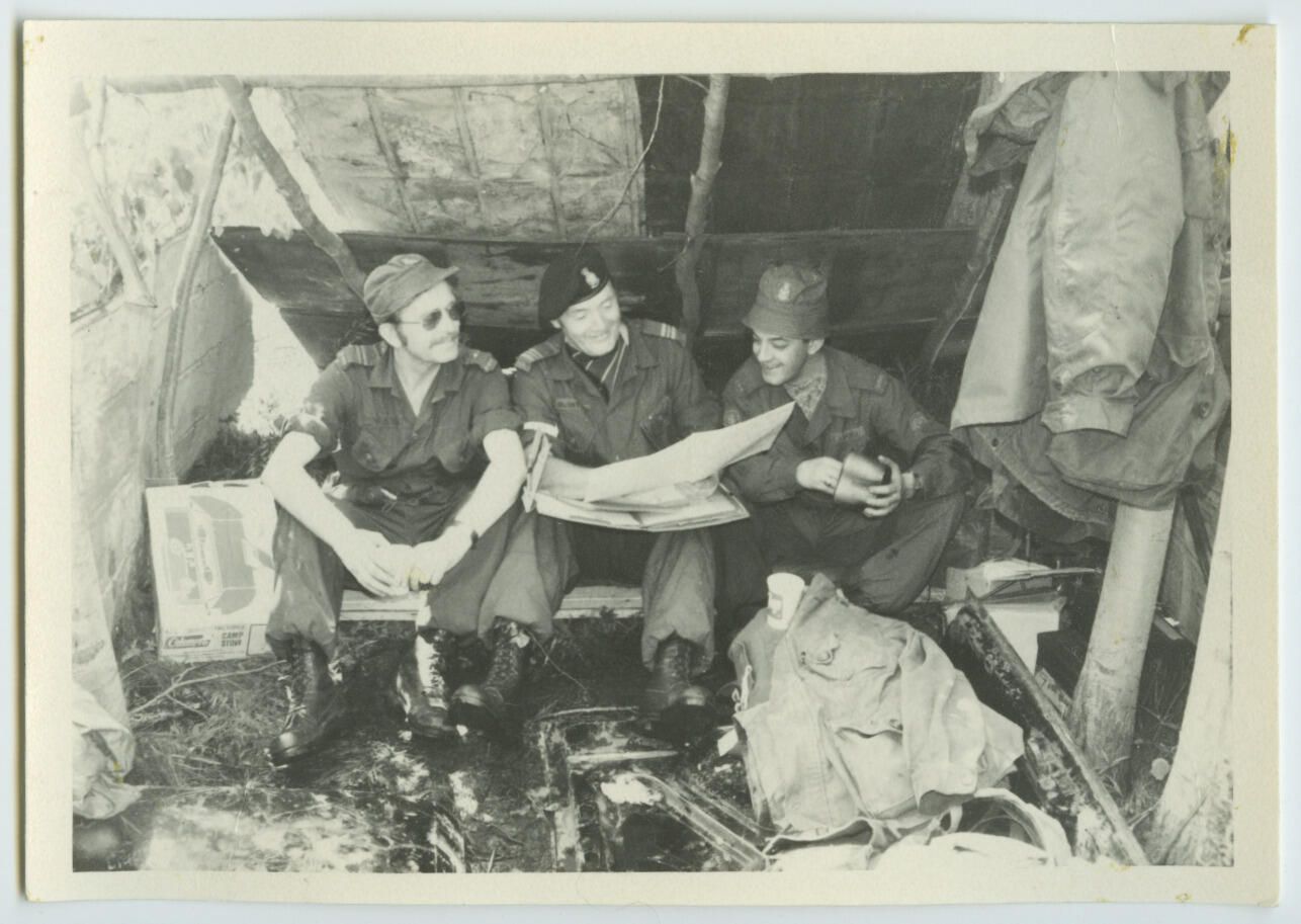A scene from a Royal Montreal Regiment exercise taking place at Camp Farnham. Here, Captain Frank Wall, Major George McIntosh and Master Warrant Oofficer Johnny Lavoie are reading a map under the cover of an improvised lean-to shelter.Photograph Details