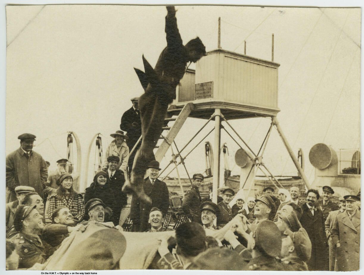 A black and white photo of officers, men and civilians on the deck of the His Majesty's Troop Transport (HMT) Olympic. The officers and men are playing a game of blanket toss where a volunteer contestant is tossed in the air by use of a taut blanket.