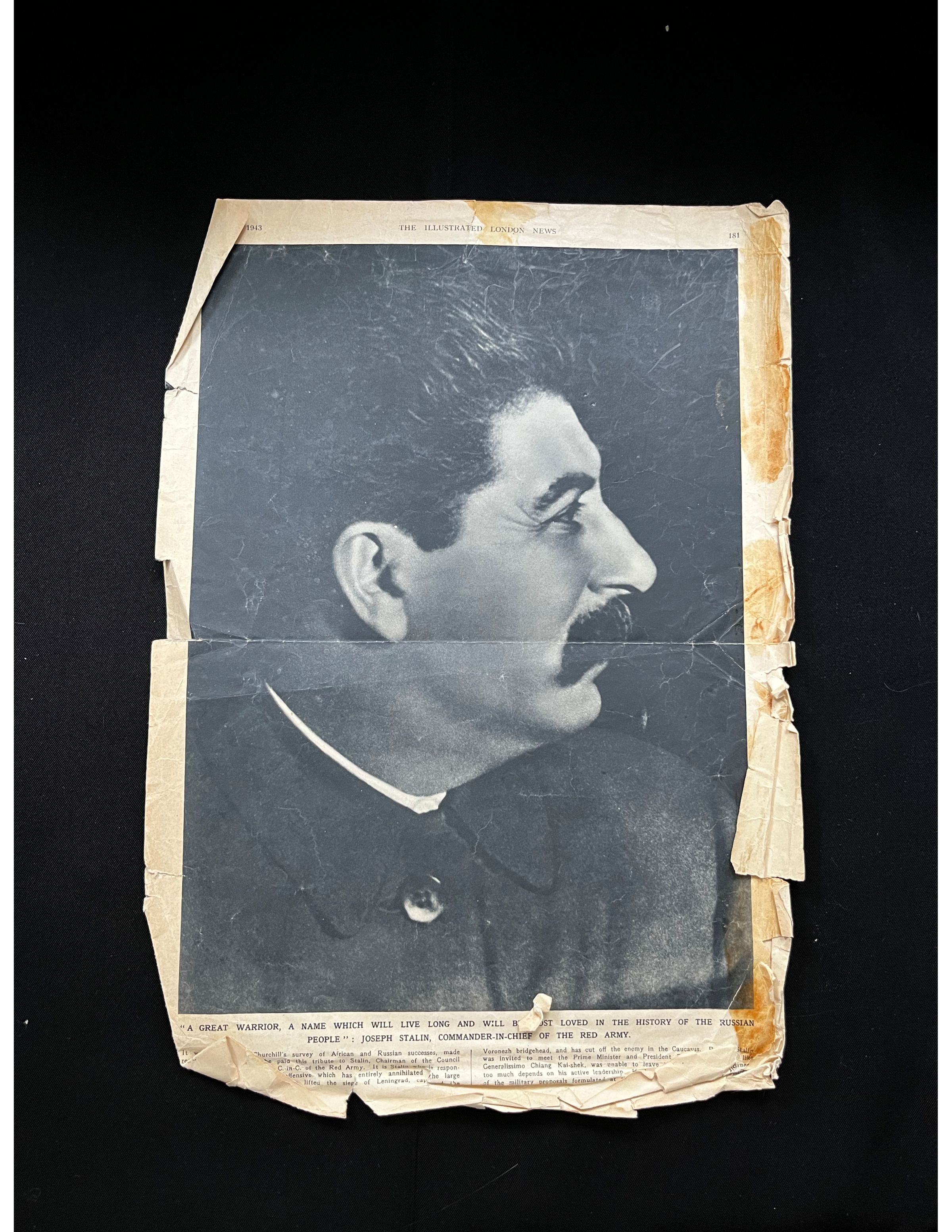 One page from The Illustrated London News, Feb 13, 1943. One side has a full page photo of Joseph Stalin and the other side has a story about The Gobi Desert in Asia.