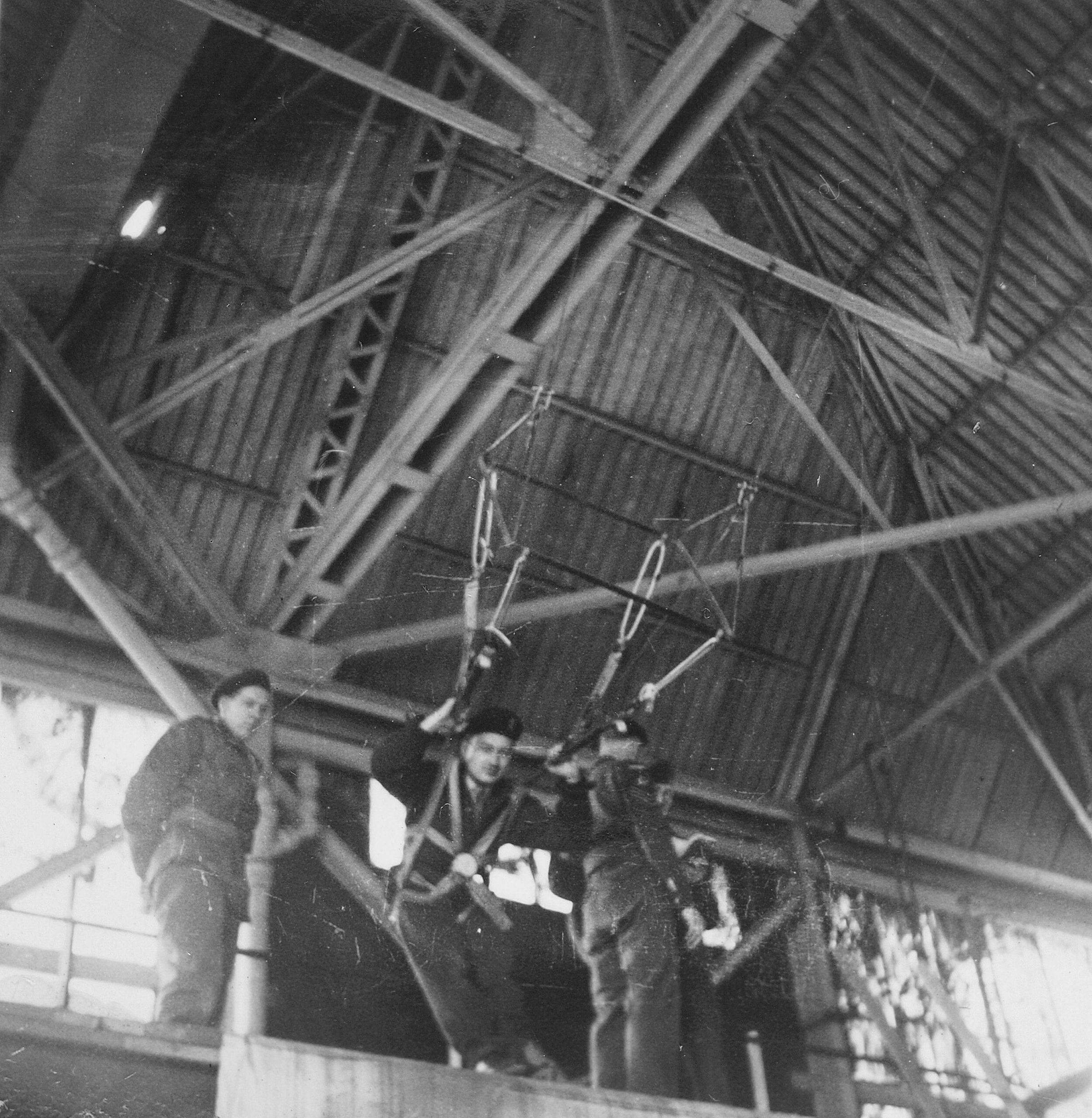 A black and white photo of Lieutenant Keith William MacLellan, preparing to jump off, in an indoor parachute training harness.Photograph Details