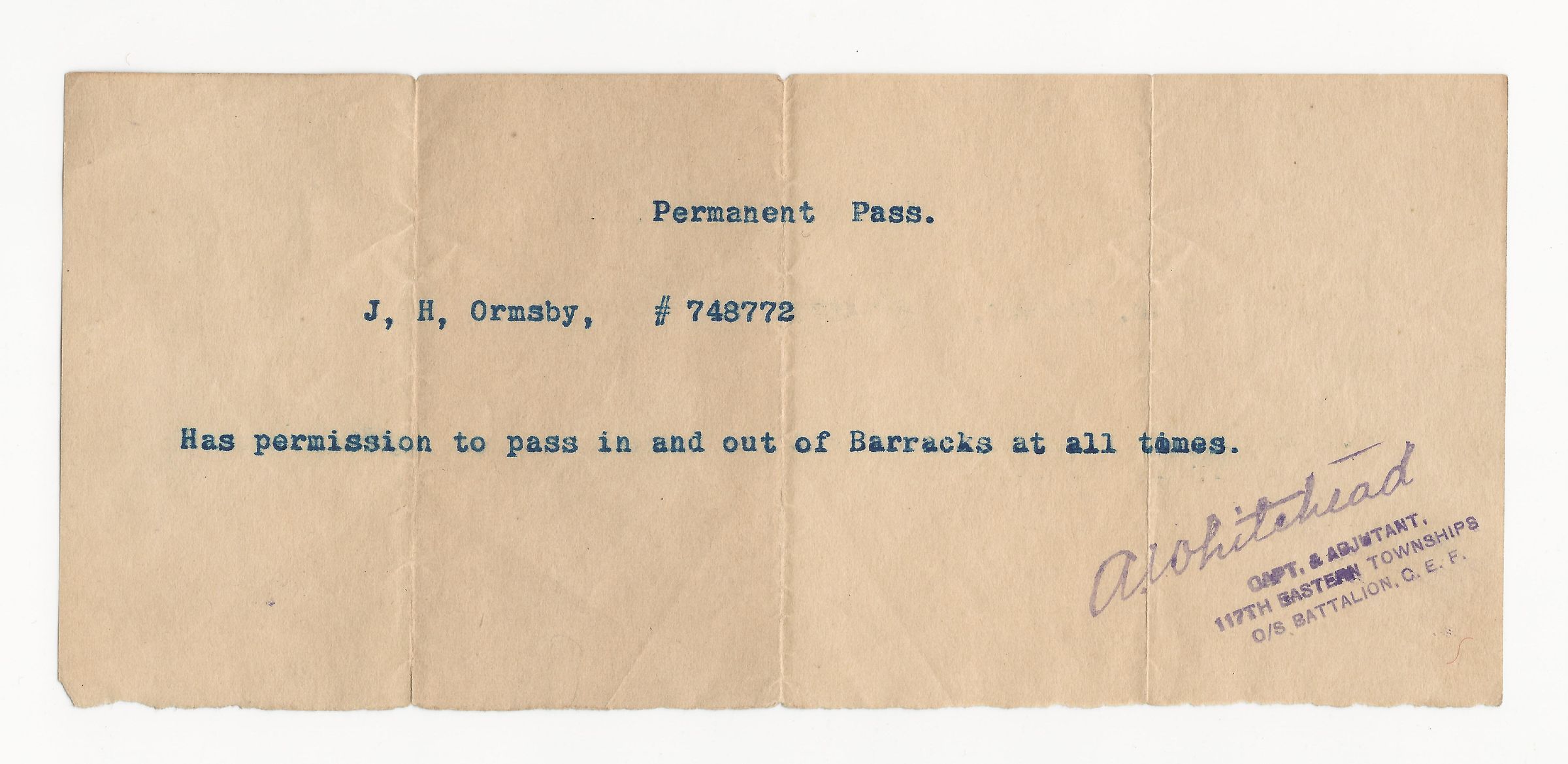 John Henry Ormsby was a 21 year old teacher was born at Hamilton, Ontario, January 1895. He enlisted with the 117th (Eastern Townships Battalion) at Leeds, Ontario, on March 6, 1916. He was discharged at Valcartier Camp, Quebec on August 4, 1916 as medically unfit due to recurring fits of hysteria. Later, using the name John Harry Ormsby he was conscripted under the Military Service Act of 1917 and signed his enlistment papers at Quebec City on July 9, 1918 but was again discharged there on August 1, 1918.