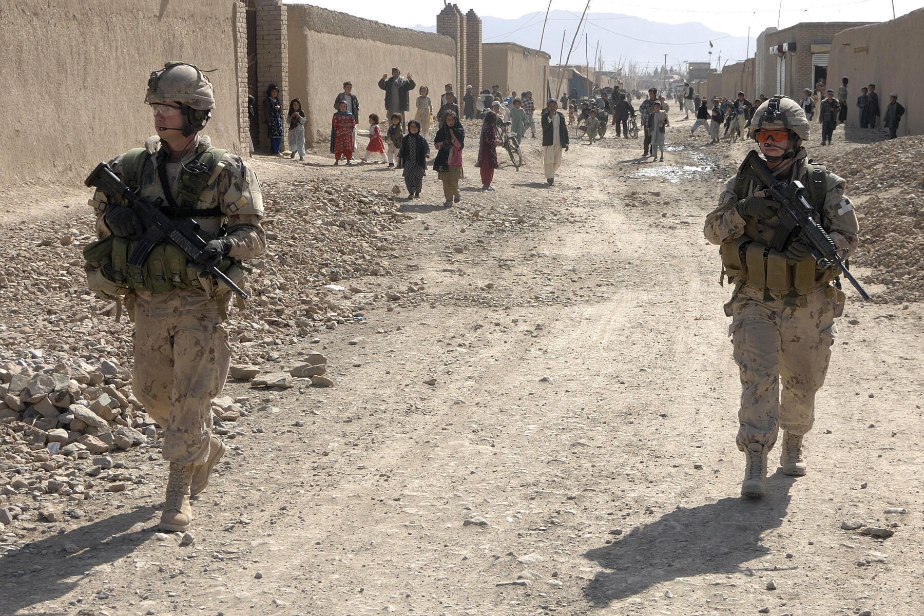 Two Canadian soldiers on patrol in the streets of Kandahar City. Both of them are wearing the full protective attire: a ballistic vest, a pair of glasses, a helmet, a load-carrying harness, spare ammunition, water & rations, their personal weapon and communication devices - enabling communication with each other and other members of the patrol.Photograph Details