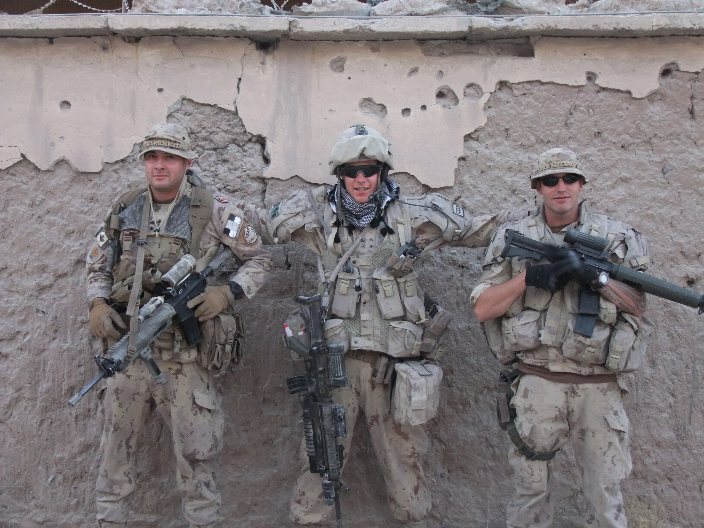 Three members of the Canadian Forces pose alongside a wall while deployed in the Kandahar region of Afghanistan.