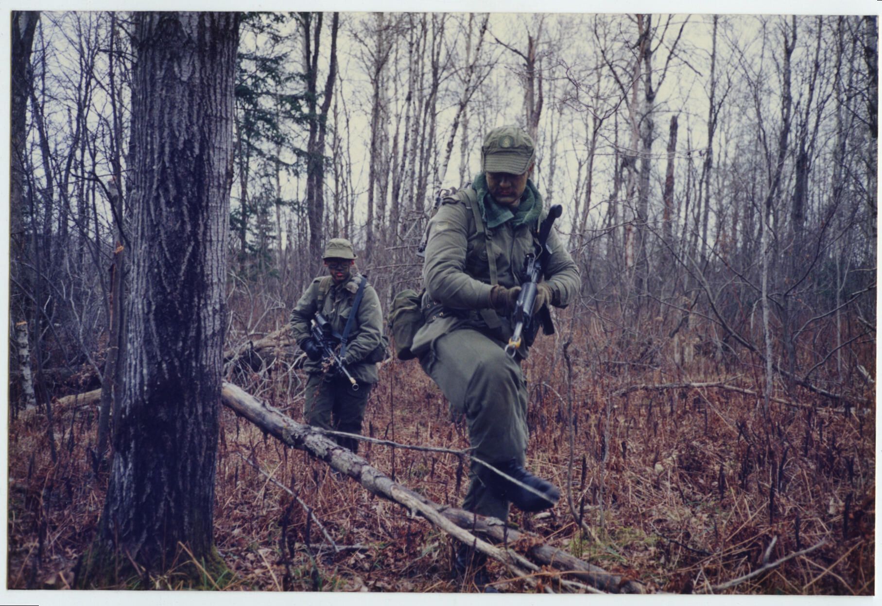 Two soldiers of The Royal Montreal Regiment are walking in the forest near Farnham Camp on a patrolling exercise.Photograph Details