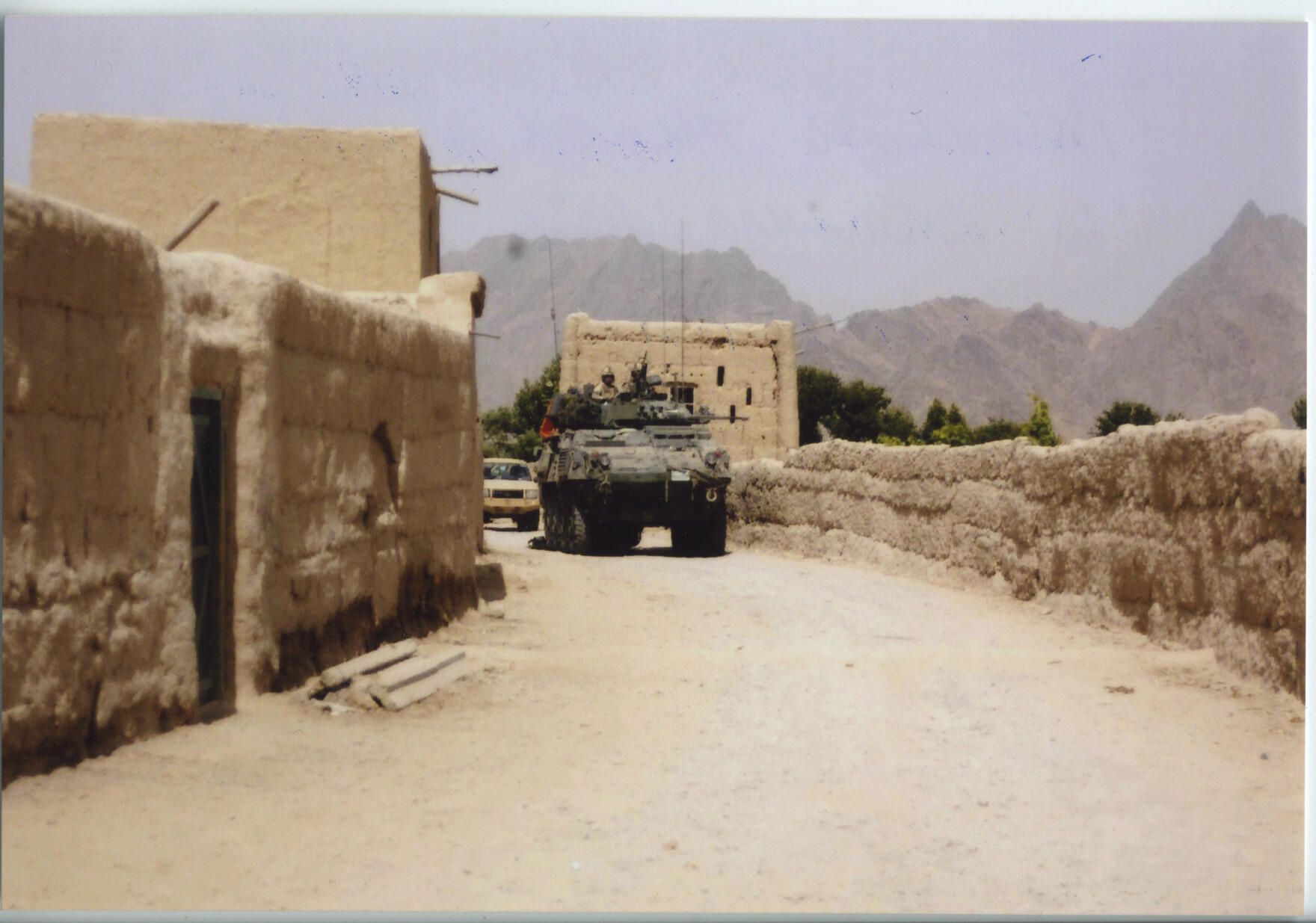 A scene from a patrol through a village in the province of Kandahar, Afghanistan. Traditional mud houses and walls are visible on both sides of the road. Using local materials, they are made with wooden poles supporting a mixture of mud and straw.Photograph Details