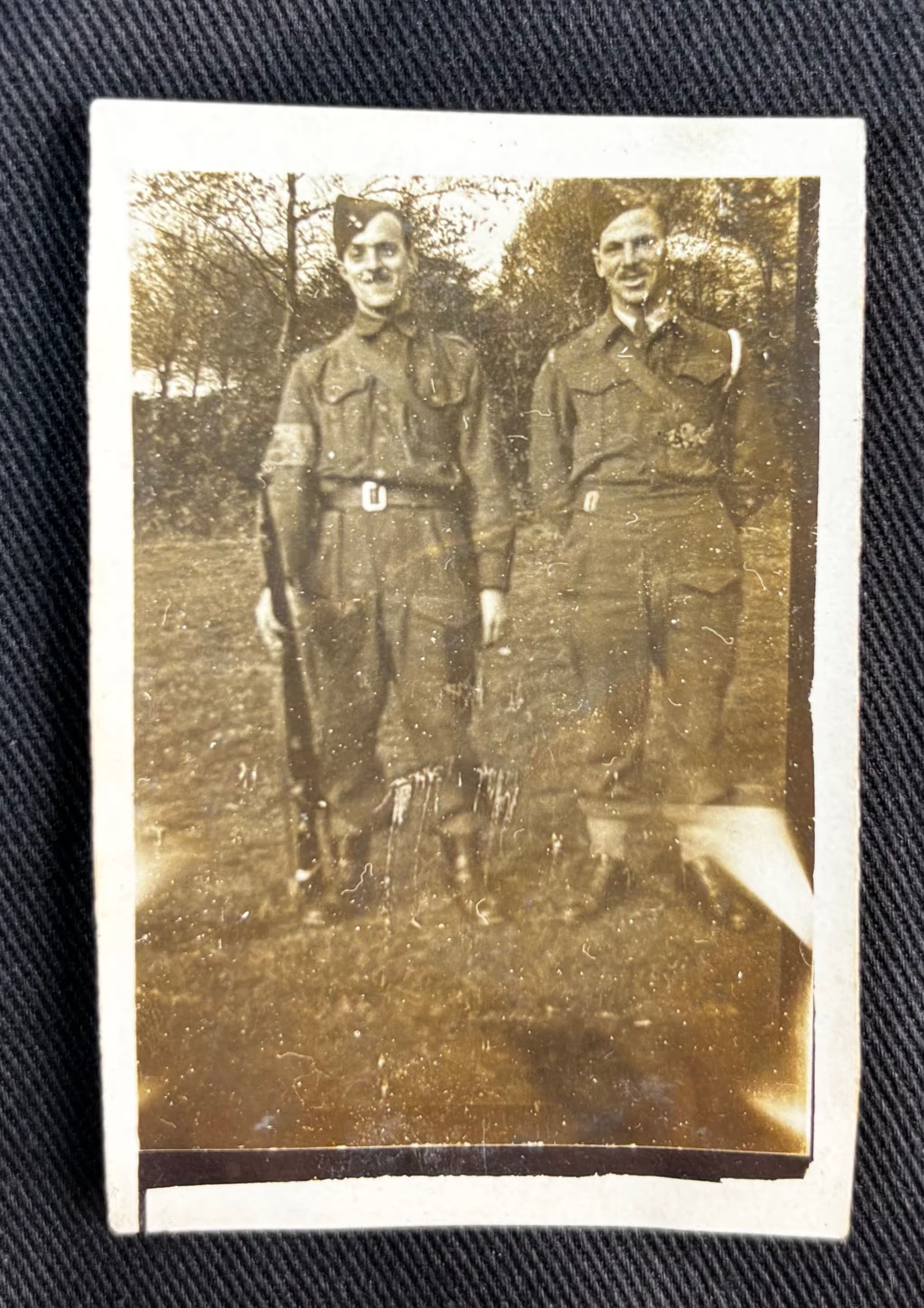 Two soldiers standing together for a photo. The man on the right is Cpl. Thomas Holliday but the man on the left is unidentified. They are both wearing Canadian wool uniforms with wedge caps. They are both wearing a cross body bag and the soldier on the left is holding a rifle on his right side. Both men have moustaches and are smiling for the photograph. They are standing in a small clearing in a forest, trees are visible in the background. The photo is scratched and there is a glare on the bottom left corner.