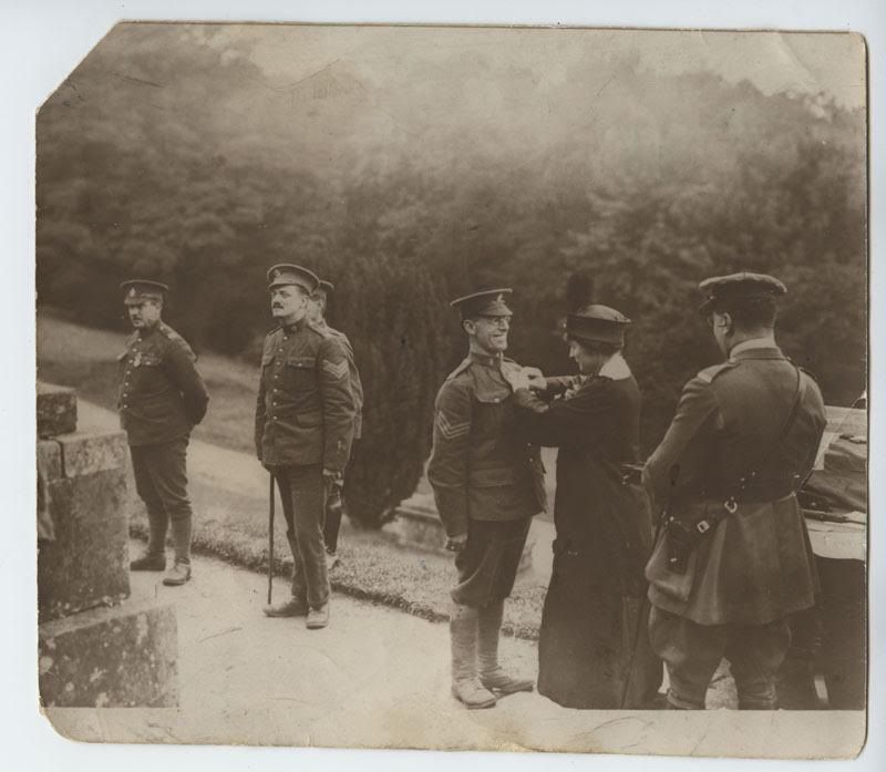 Black and white photo of CSM Bertram Brayton receiving the DCM (Distinguished Conduct Medal). The photo is taken outside, there are four other soldiers present and a woman is presenting CSM Brayton with his medal. Bertram Brayton stands proudly with a big grin on his face.Photograph Details