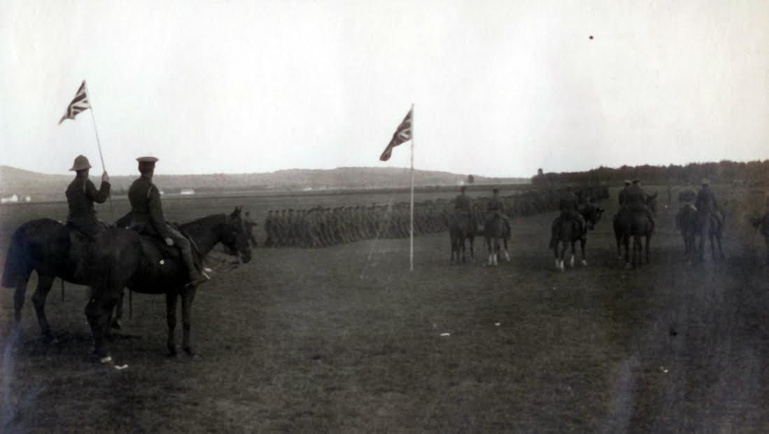 There is a second Union-Jack flag standing next to the soldiers on horseback. Rows of men in uniform march in the background.Photograph Details