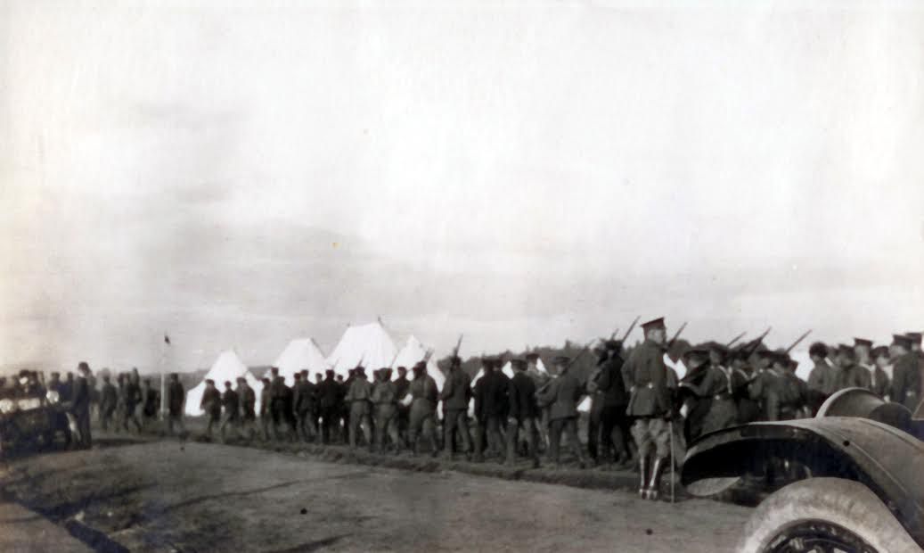 In the background of the photo behind the marching men, there is a collection of 4 large white tents. There are glimpses of other tents behind the men. There is also a dark coloured camp flag next to the cluster of large tents.Photograph Details
