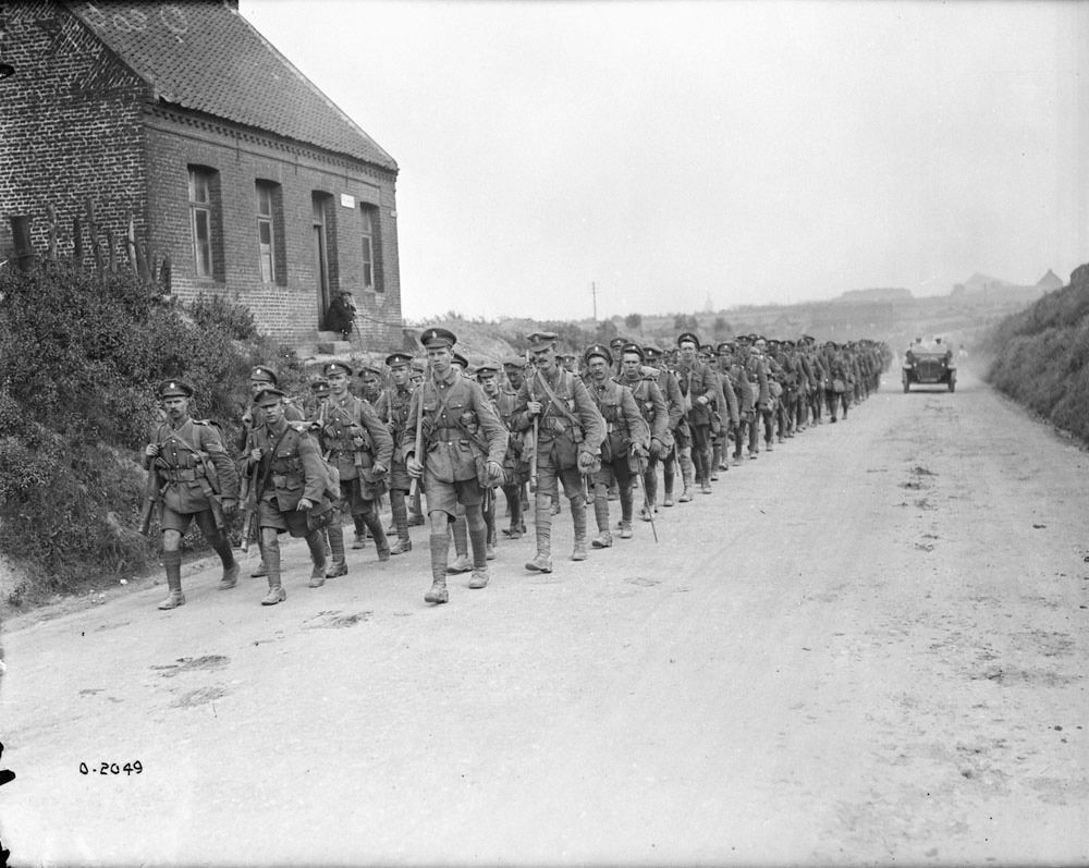 Black and white photograph of RMR soldiers marching in three lines down a country road. The men are wearing shorts instead of pants, hinting that the photo may have been taken in the summer months. They are carrying their bags and rifles. There is a vehicle driving alongside the men on the right side. On the left side there is a brick house, with a man sitting on the stoop watching the soldiers march by. In the background we can see the outline of buildings.Photograph Details