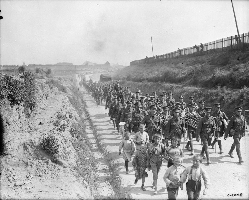 Black and white photo depicting the RMR bugle band and soldiers marching on a dirt road. They are accompanied by local children and there are bystanders watching them march from behind the fence on the right side. In the background we can see the outline of a small country town.Photograph Details