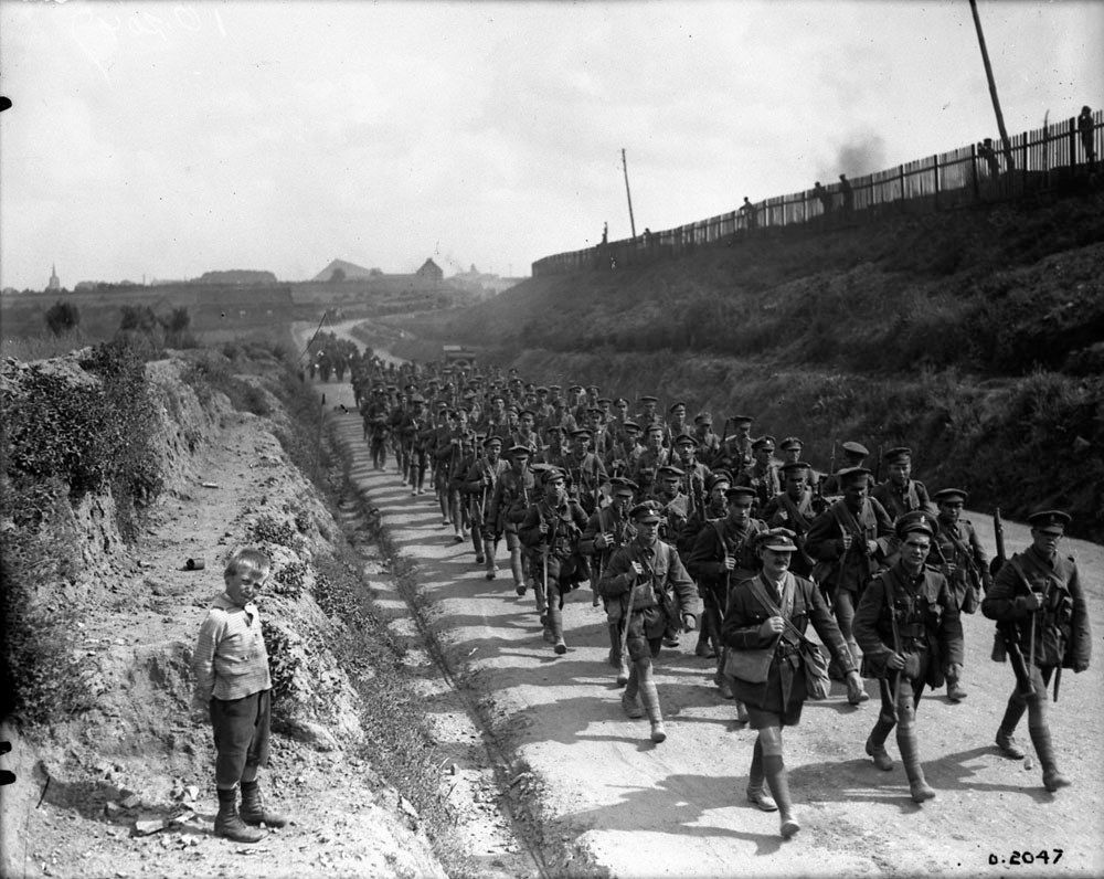 Black and white photo of RMR soldiers marching down a dirt road. The men are marching 3-4 rows and are carrying their packs and rifles. They are wearing shorts, a hint that it may be summer time. There is a little local boy on the left bank looking at the cameraman. On the right side, there are people watching the soldiers march by from behind a fence. In the background we can see the shapes of buildings from the nearby town.Photograph Details