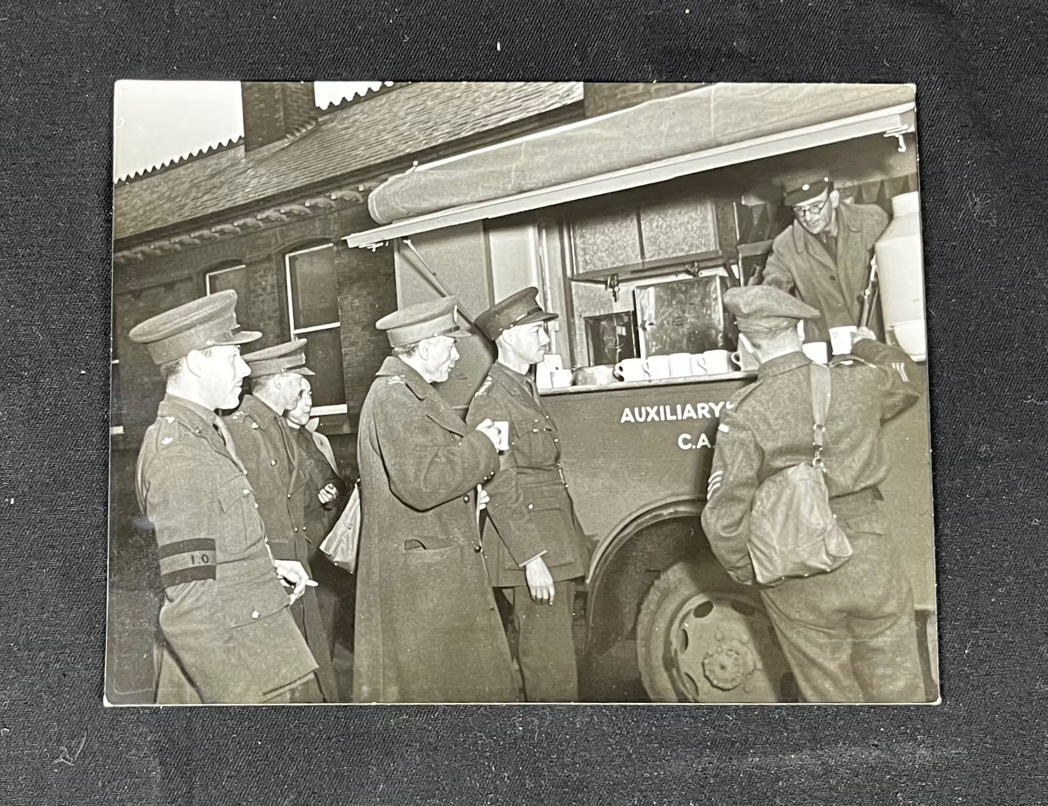 Black and white photo of 6-7 soldiers waiting at the auxiliary van for coffee and tea. The van is parked in front of a brick building/home. There is a worker inside the van serving the men, with a row of white coffee cups lined up on the counter. A man with his back to the camera is mid-grabbing a cup. He wears a satchel bag on his back. One man in a long coat drinks from his cup and he is identified on the back of the photo as General A.G.L. McNaughton. Next to him is Captain Clarence Churchill Mann. The soldier who is far left, holding a cigarette is Lt-Col Magnus.