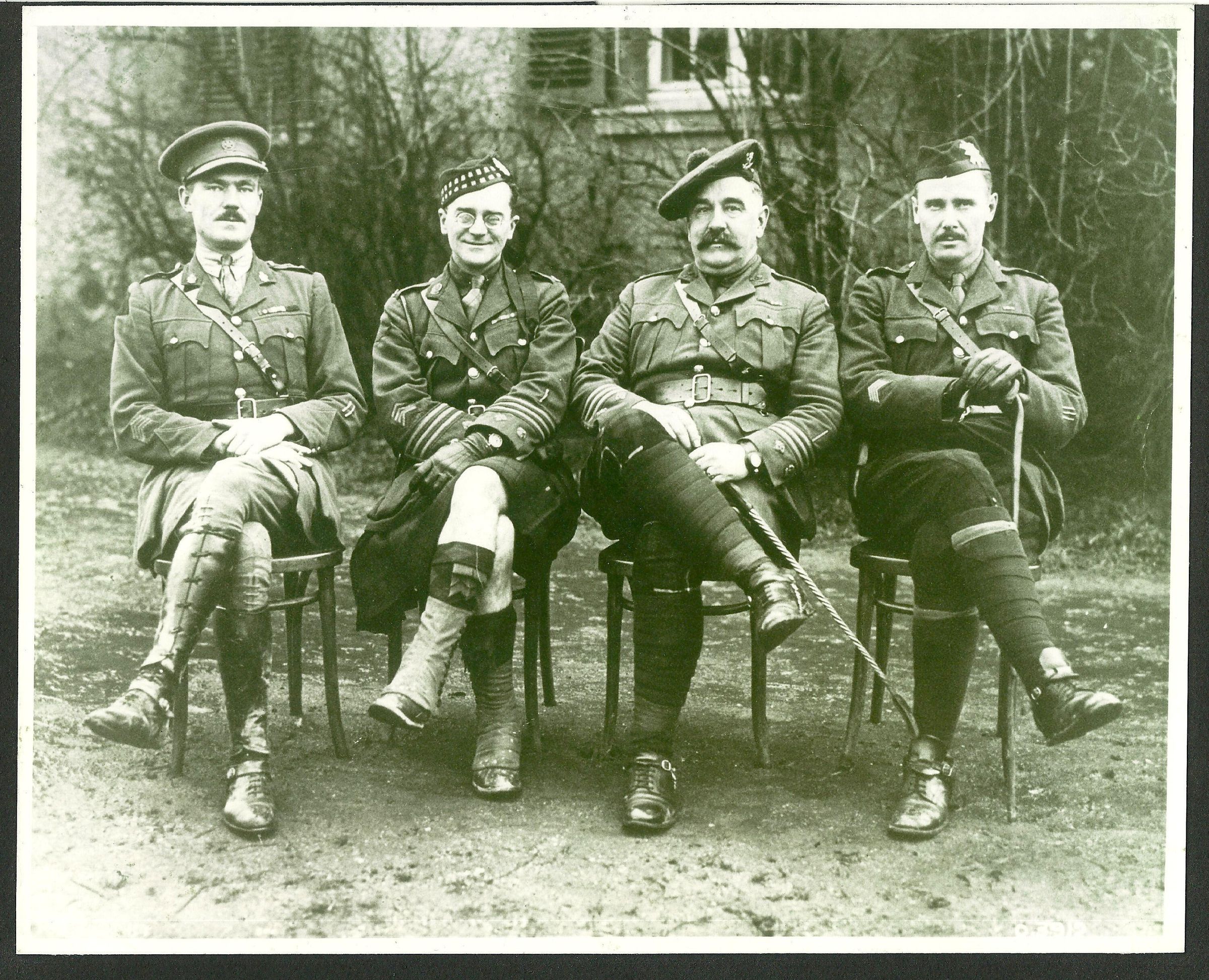 A photo of the commanding officers of the 3rd Canadian Infantry Brigade: 13th Battalion, The Royal Highland Regiment of Canada (the Black Watch), CEF, (Montreal); 14th Battalion, The Royal Montreal Regiment, CEF (Montreal); 15th Battalion, 48th Highlanders of Canada, CEF, (Toronto); 16th Battalion, The Canadian Scottish, CEF, (Victoria)