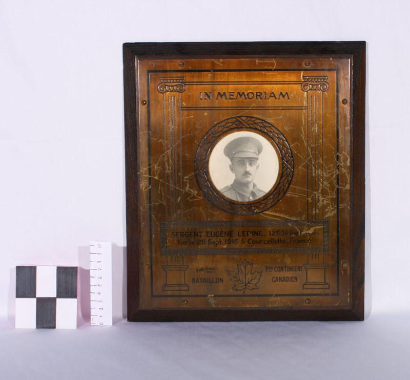 A brass plaque on a wood base with a round portrait of Sgt. Eugene Lepine in the centre. Eugene was killed in action on Sept 26, 1916 near Courcelette, France. He was 21 years old. His name is on the Vimy Memorial, FranceMade/Created
