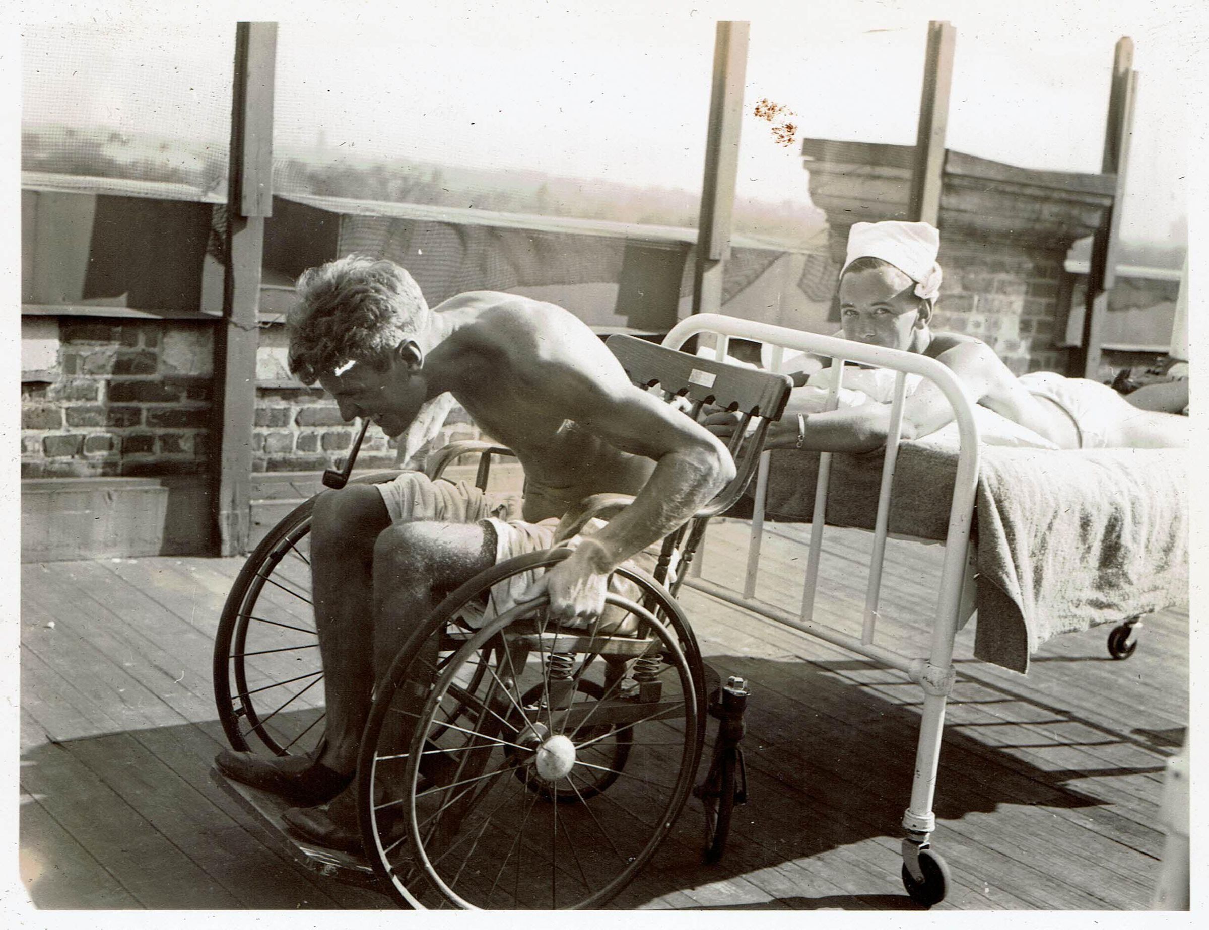 A black and white photo of Bill Sales and Romero Forhan on the rooftop deck of the Christie Street Military Hospital in Toronto during their sunbathing session. They are entertaining themselves as one is towing the other using a wheelchair. This picture was taken during the convalescence of Southmayde S. Scovil.Photograph Details