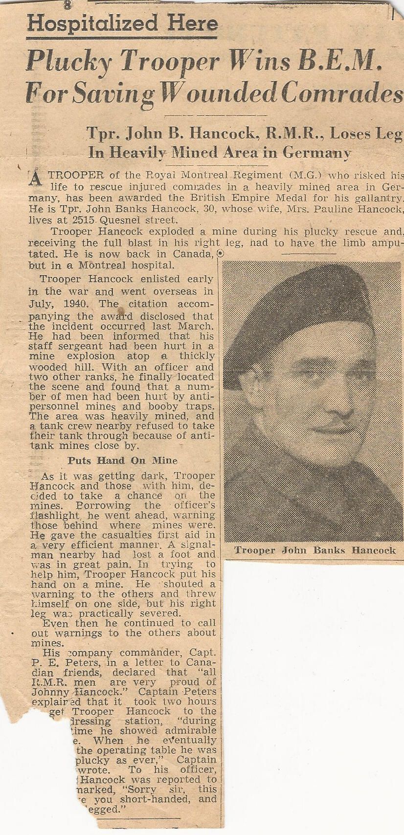 A newspaper clipping covering the story of Trooper John B. Hancock from The Royal Montreal Regiment injured in Germany. He was awarded the British Empire Medal for risking his life rescuing a wounded comrade.