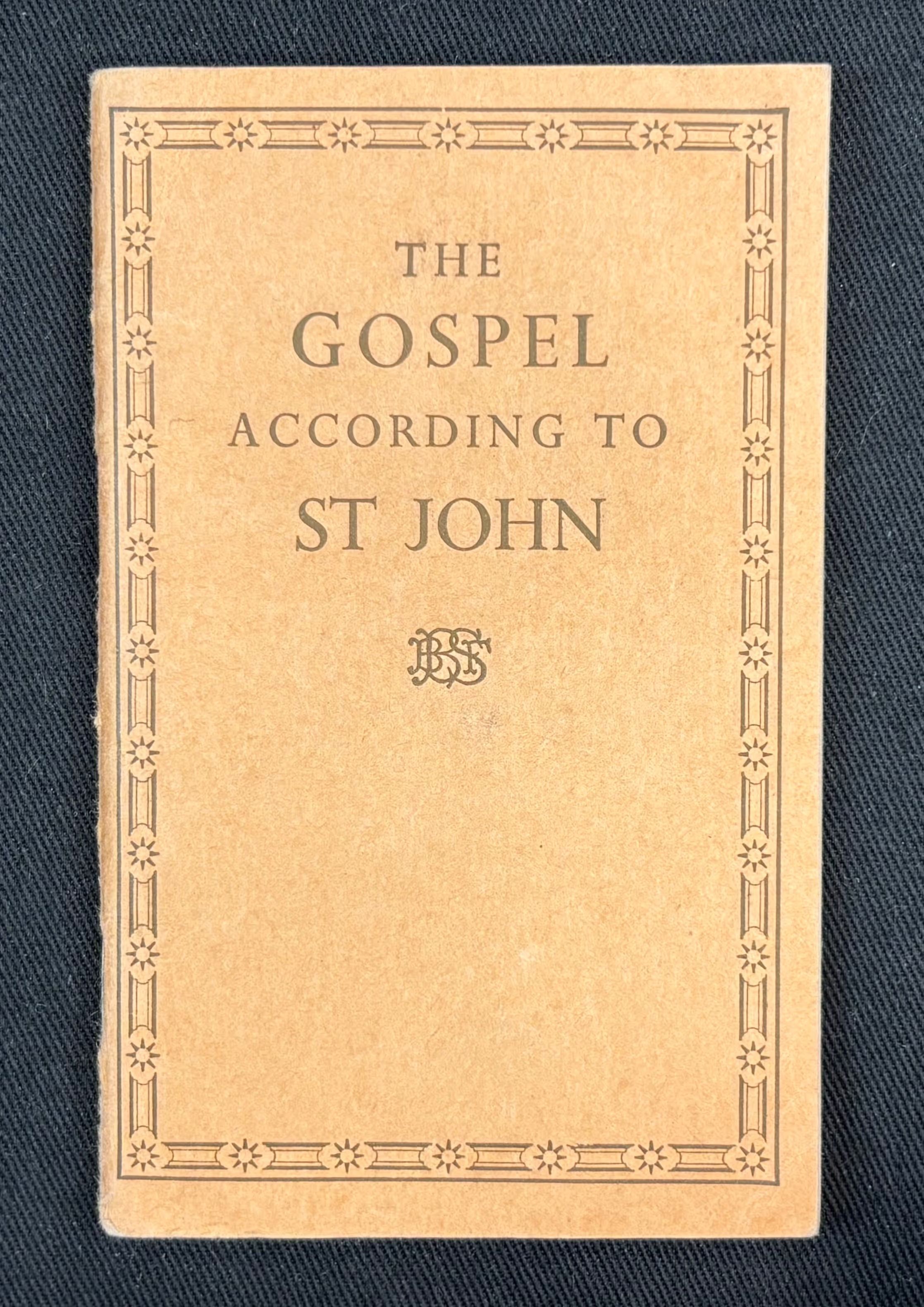 Small red/orange coloured pocket gospel (The Gospel according to St John). Printed at the Cambridge University Press, these small religious prayer books were given to service people by the British and Foreign Bible Society in Canada and Newfoundland in time of war.Lexicon