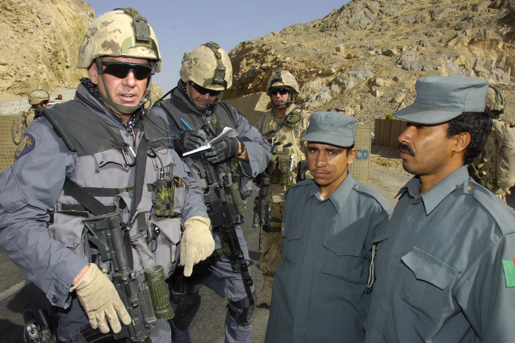 Two Canadian police constables from the Royal Canadian Mounted Police are giving instruction to a group of Afghan police students. The Canadian policemen are carrying Canadian military rifles, communication equipment, sunglasses and arid covered helmets.Photograph Details