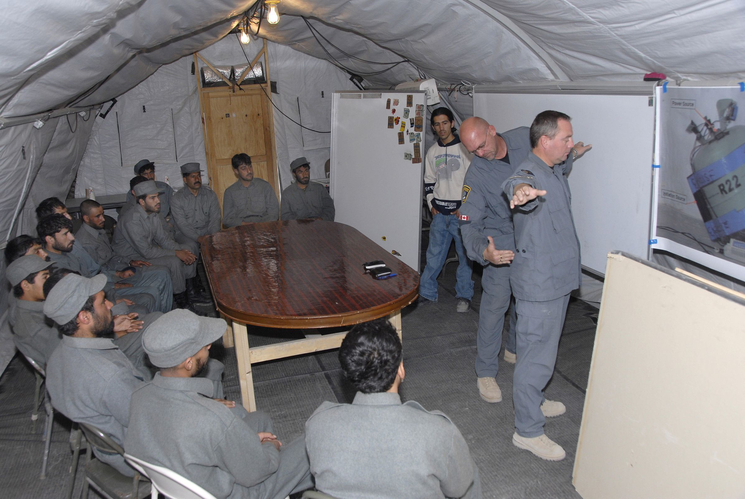 Two Canadian police constables are conducting a demonstration and explaining various search techniques to a class of Afghan police students. Behind the instructors, an Afghan interpreter wearing a white shirt, is translating for the class.Photograph Details