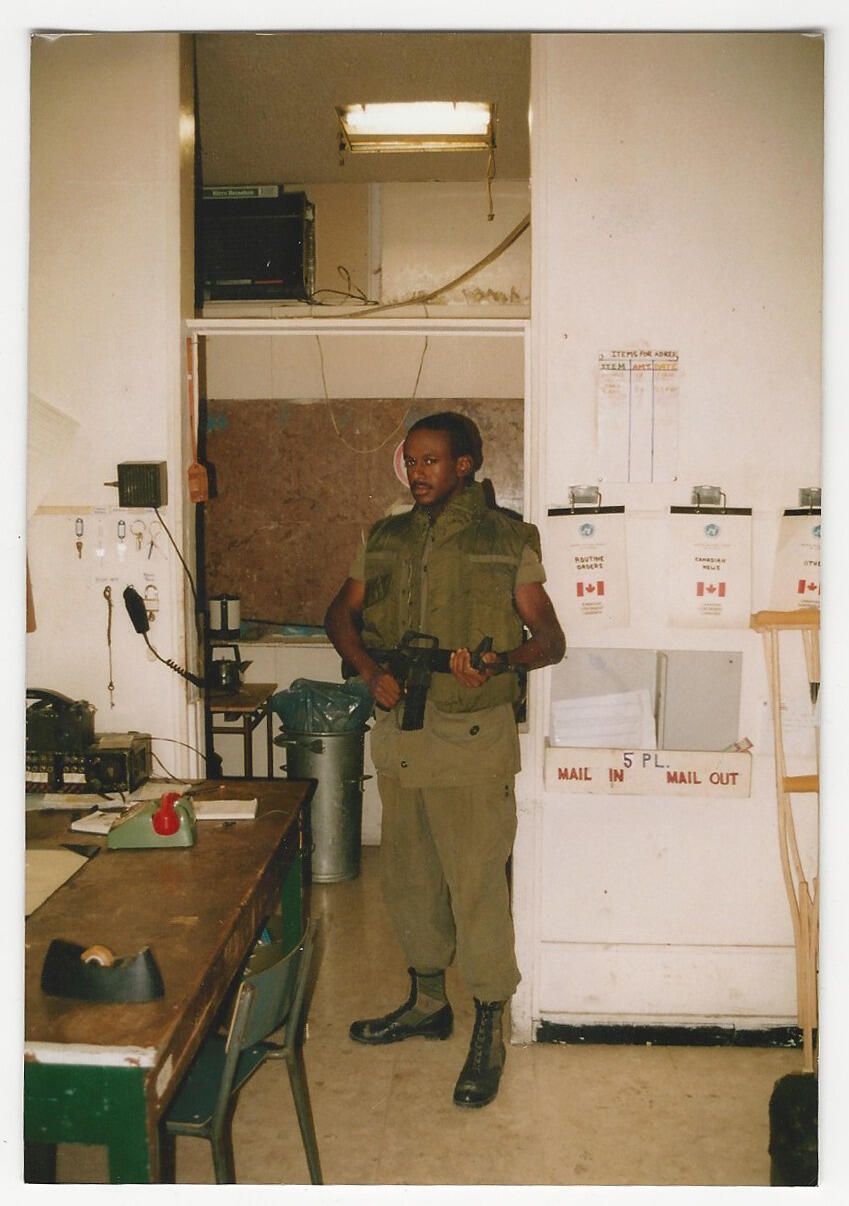 Corporal Cyril Jordan is posing with his weapon in the B Company Orderly Room in Croatia while he was part of the United Nations Protection Force in Croatia.Photograph Details