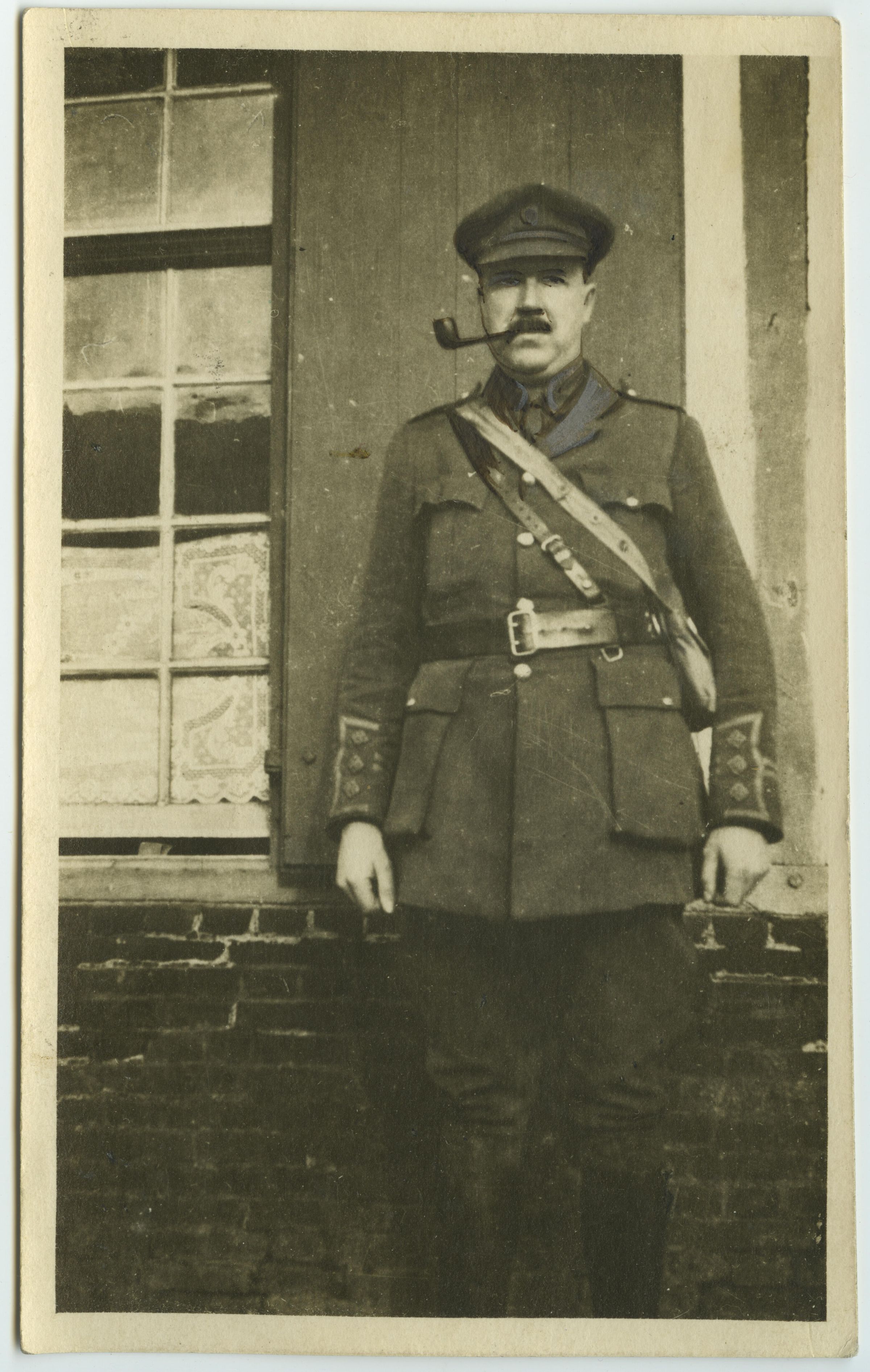 Captain Thomas Roderick MacKenzie in Service Dress with a pipe in his mouth. He is standing in front of a building which has a large multi-paned window with lace curtains on the inside on the left of the picture.Photograph Details