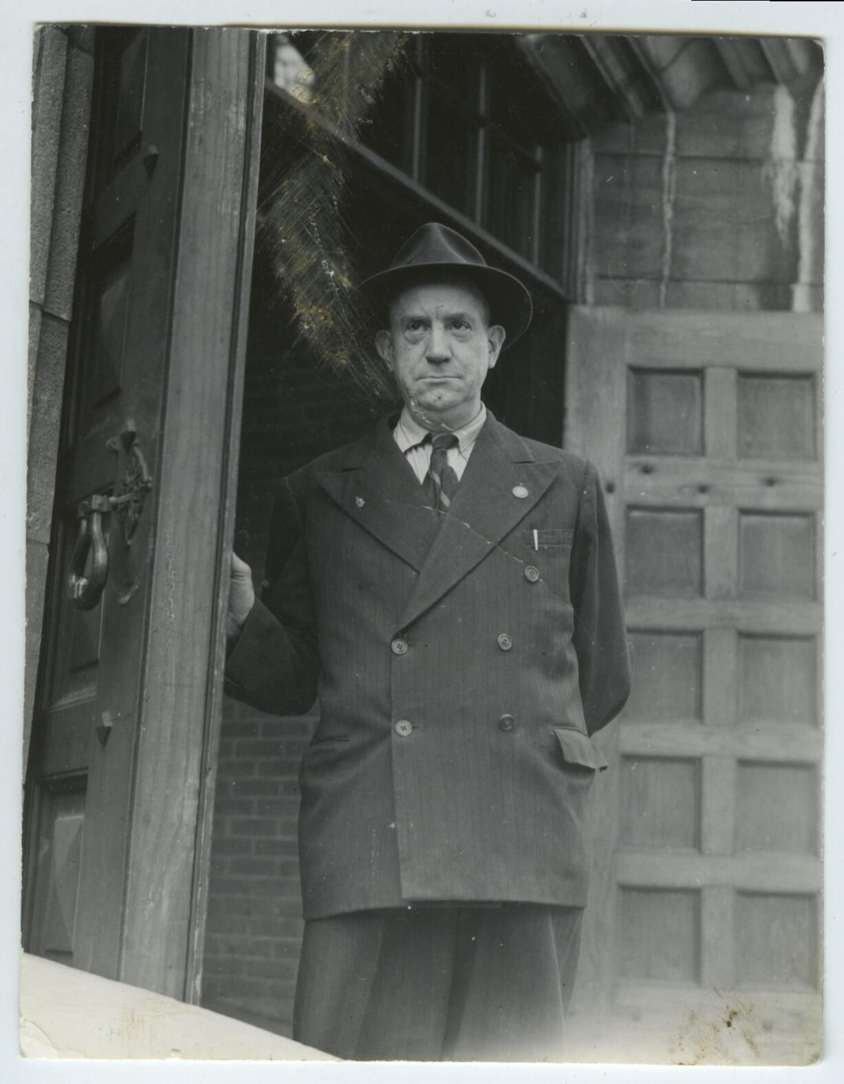 A photograph of Mr. Bill Hughes, the assistant caretaker of The Royal Montreal Regiment Armoury taken in 1945. He is dressed in a business suit and tie with his fedora hat and standing in the open main doorway of the St. Catherine Street armoury. He has a Veterans Service badge in his left lapel signifying he had served in WWI.Photograph Details