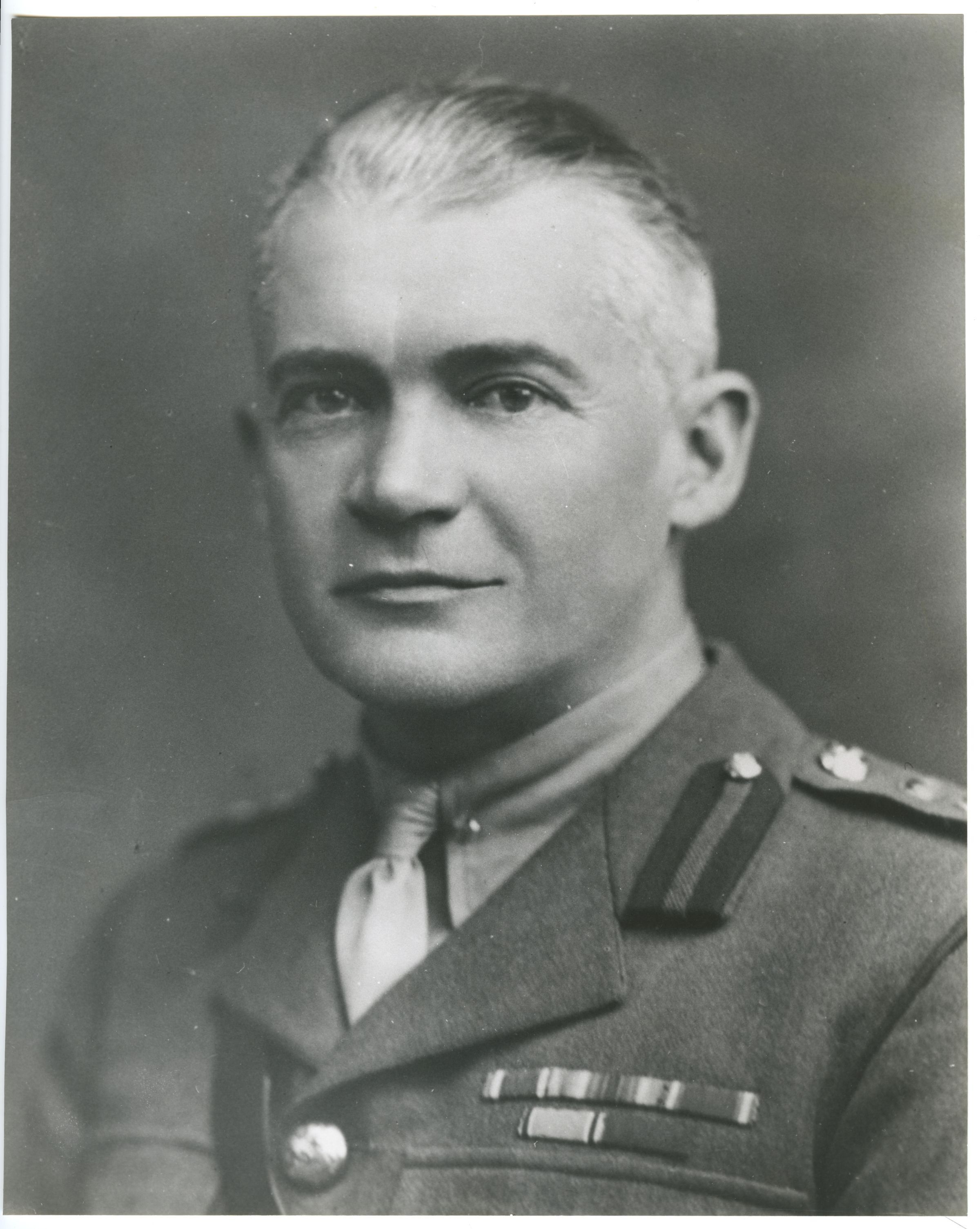 A black and white portrait photo of Brigadier G. Victor Whitehead, VD. He is wearing his service dress uniform and Sam Browne belt.Photograph Details