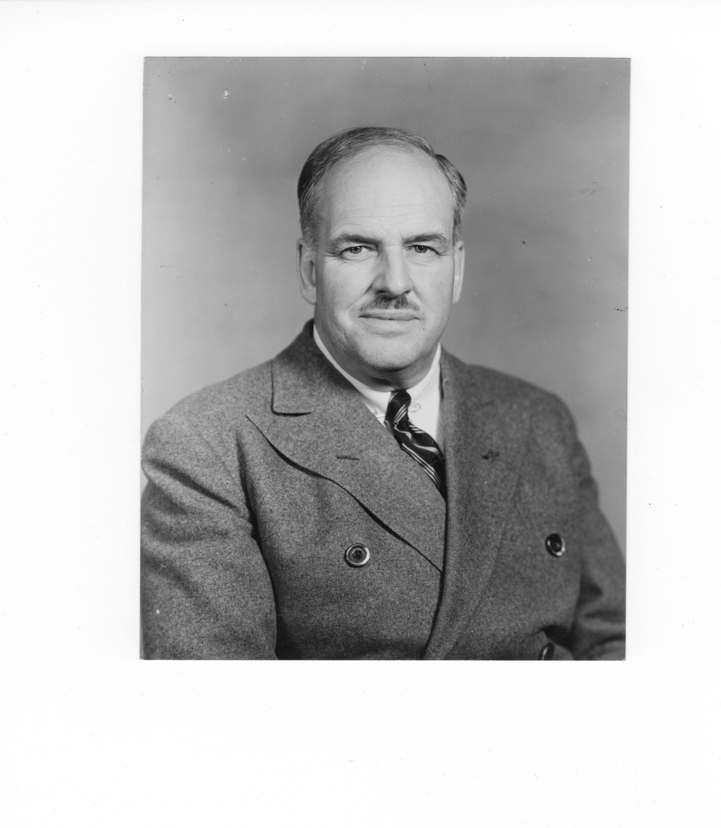 Black and white portrait of Lieutenant-Colonel Charles Basil Price, date unknown but likely taken in the 1960s. In this portrait, he wears a civilian suit, what seems to be a double brested wool overcoat/jacket, a white shirt and his regimental RMR tie.
