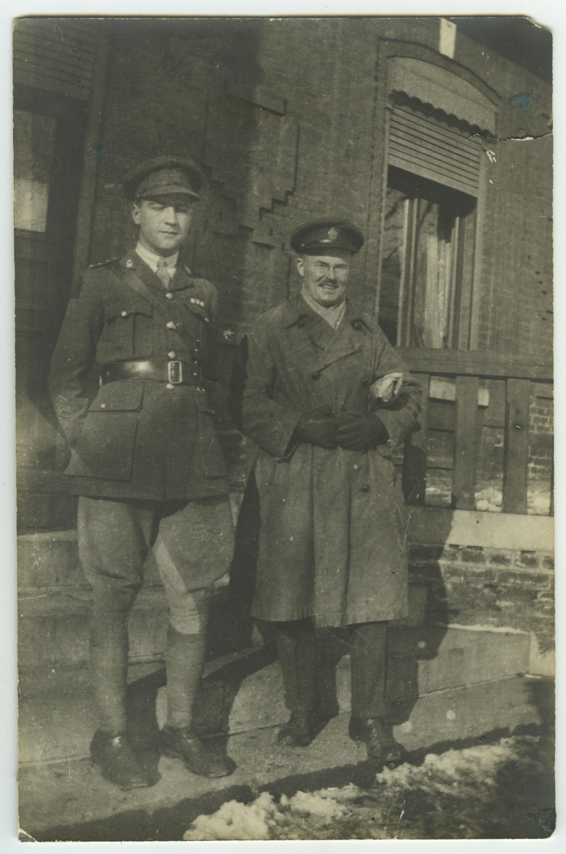 Capt A.T. Howell MC on the left and Capt "Flapper" Adams on the right are standing on the sidewalk of a street in Unter Eschbach, Germany in January 1919. Behind them is a building and a window. The picture was taken by Col H.G. Brewer.Photograph Details