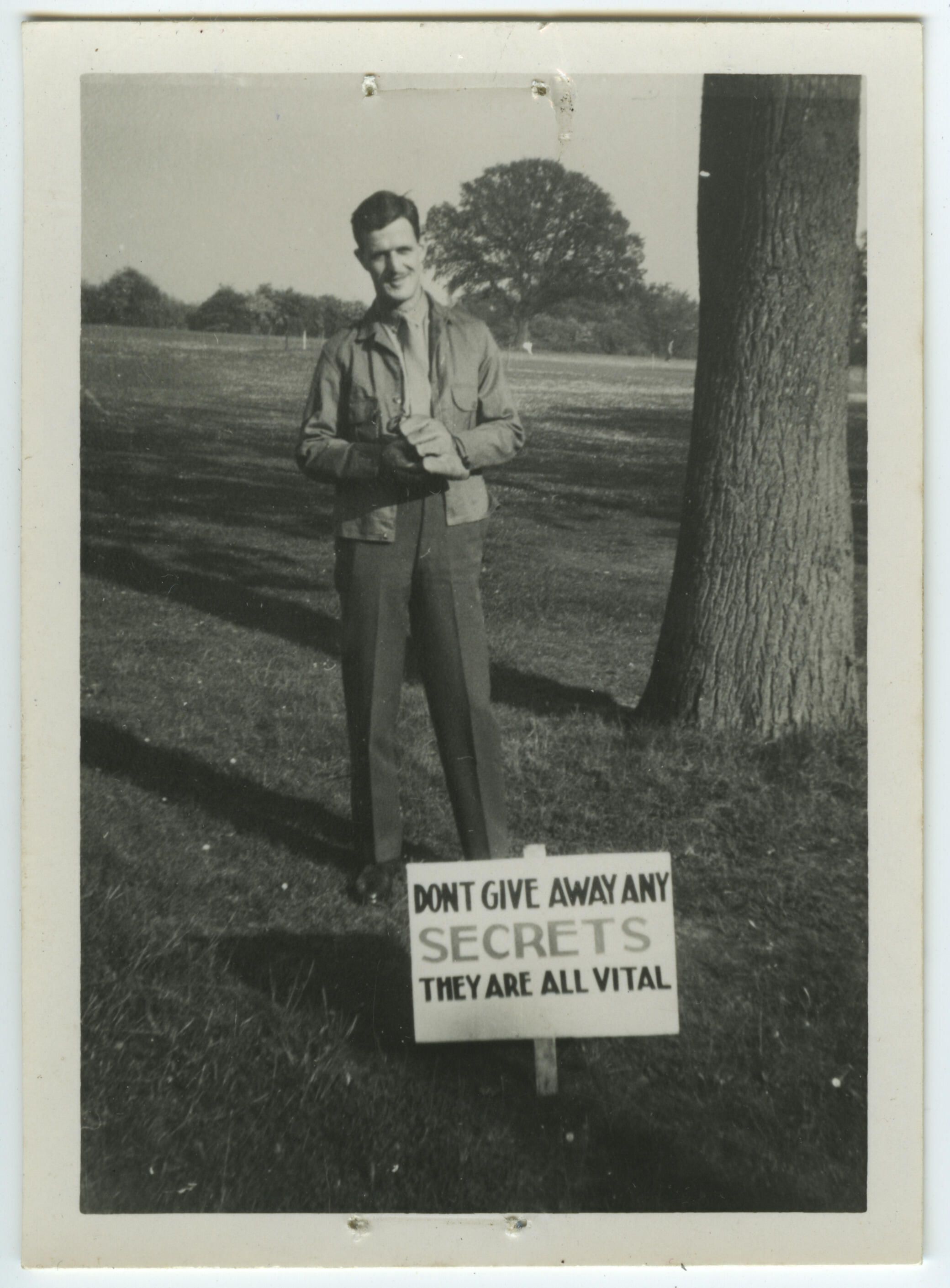 A black and white photo of Captain Geoff Turpin wearing a service dress shirt and trousers. He is also wearing a civilian windbreaker. He is holding a baseball mitt as he stands on the village green, opposite Montreal House in England. The sign in front of him reads "Don't give away any secrets/ They are all vital.'' It is a propaganda poster reminding people to avoid careless talk during wartime.Photograph Details
