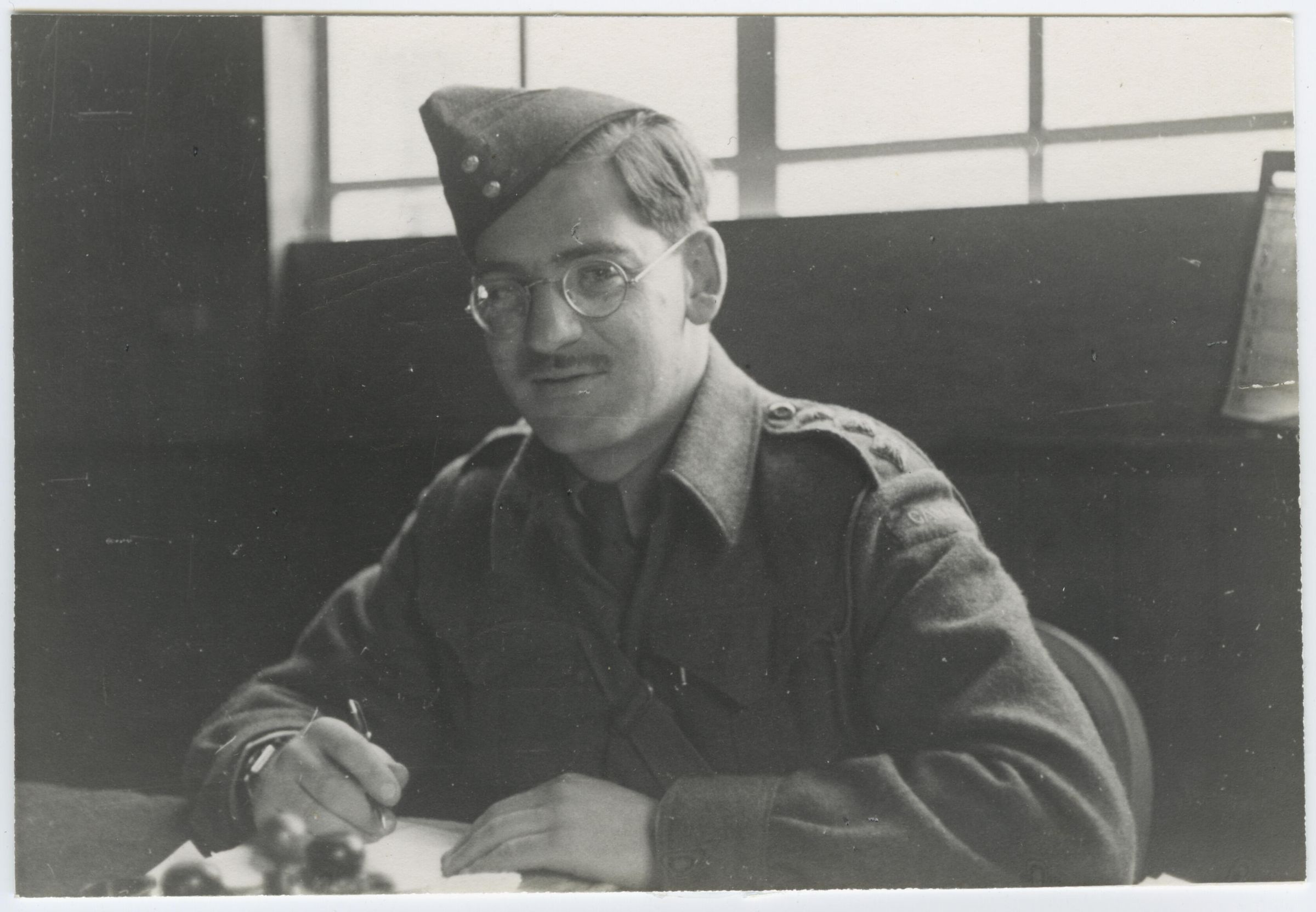 A black and white photo of Captain John L. Blue, the Quartermaster (Supply Officer) of the 1st Battalion, The Royal Montreal Regiment. He is wearing a battledress uniform and a wedge cap.Photograph Details