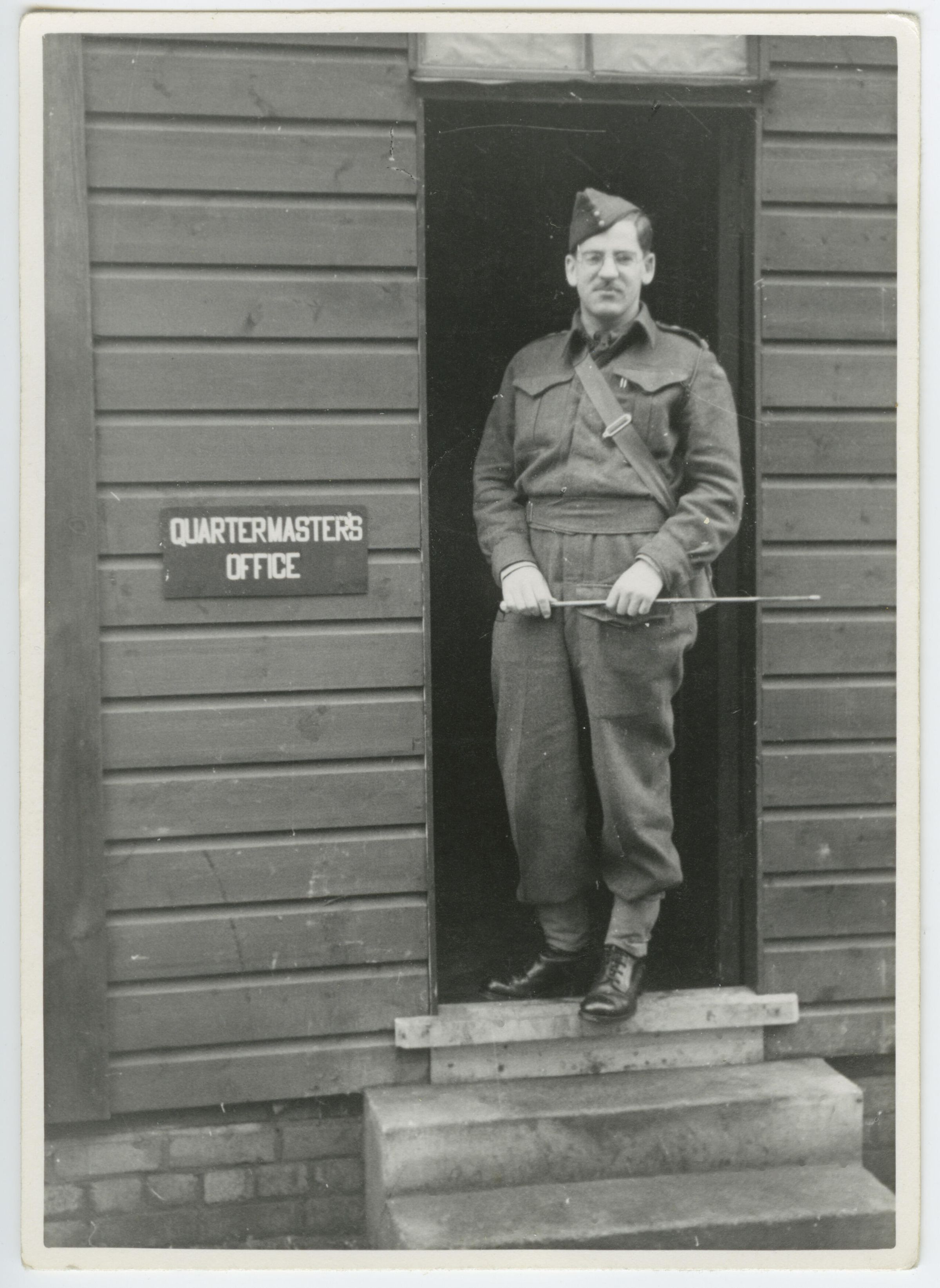 Captain John L. Blue, the Quartermaster Officer for the 1st Battalion, Royal Montreal Regiment is standing at the entrance of his QM stores. He is holding a swagger stick.