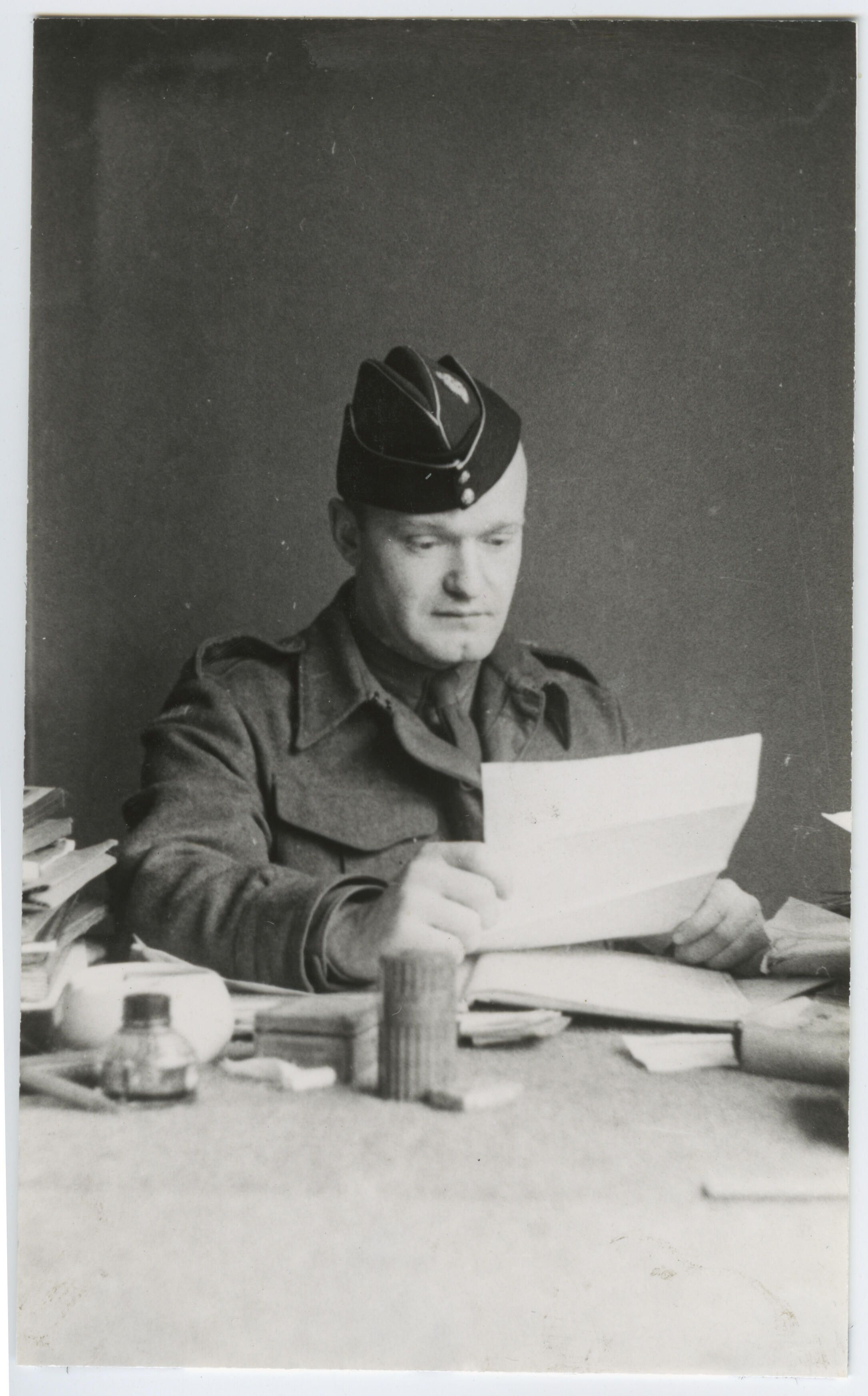 A black and white photo of Medical Officer Captain Kenneth R. Mackenzie of the1st Bn. RMR reading and working on paperwork.Photograph Details