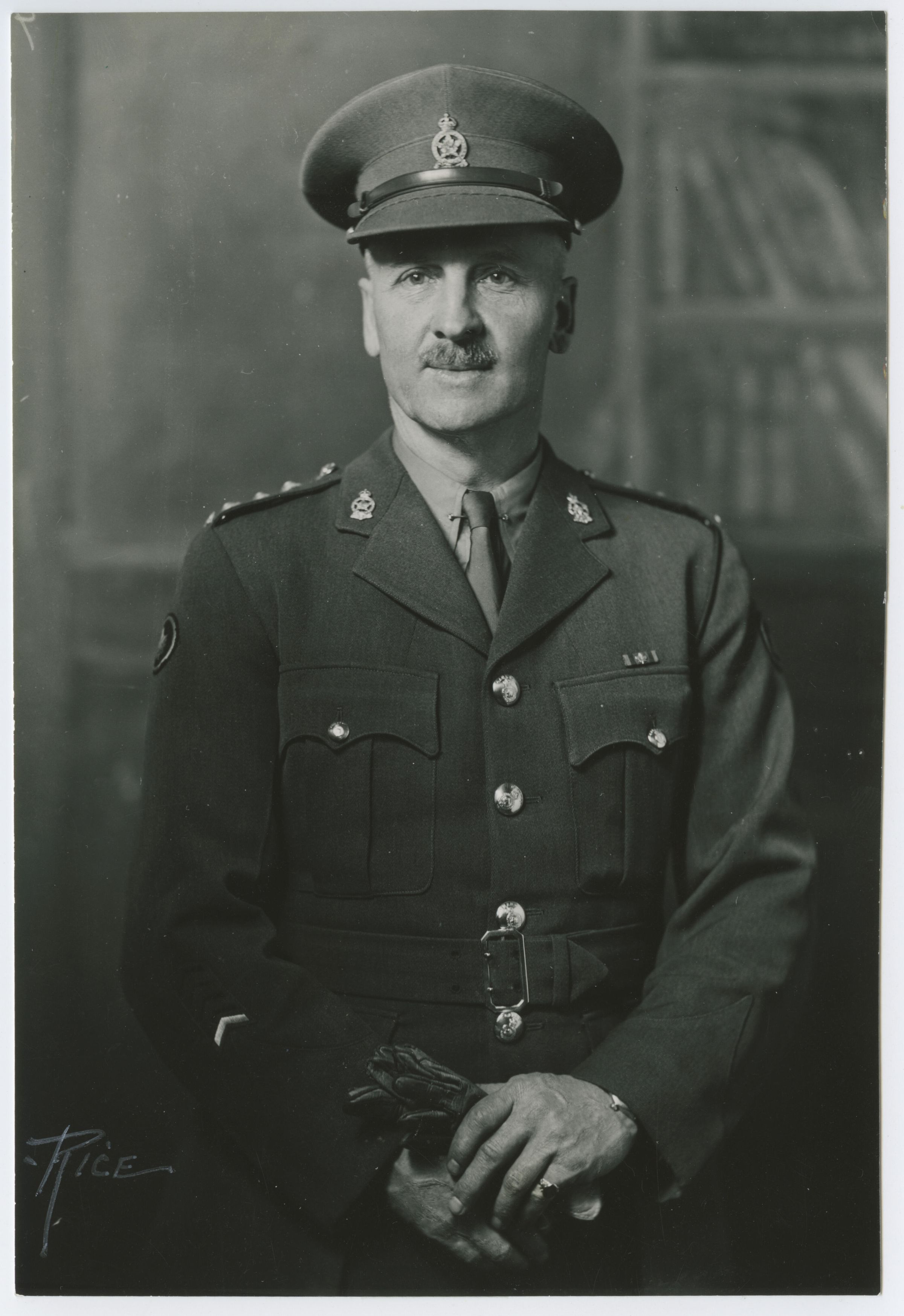 A black and white portrait photo of Captain Stanley King of the 1st Battalion, The Royal Montreal Regiment.Photograph Details