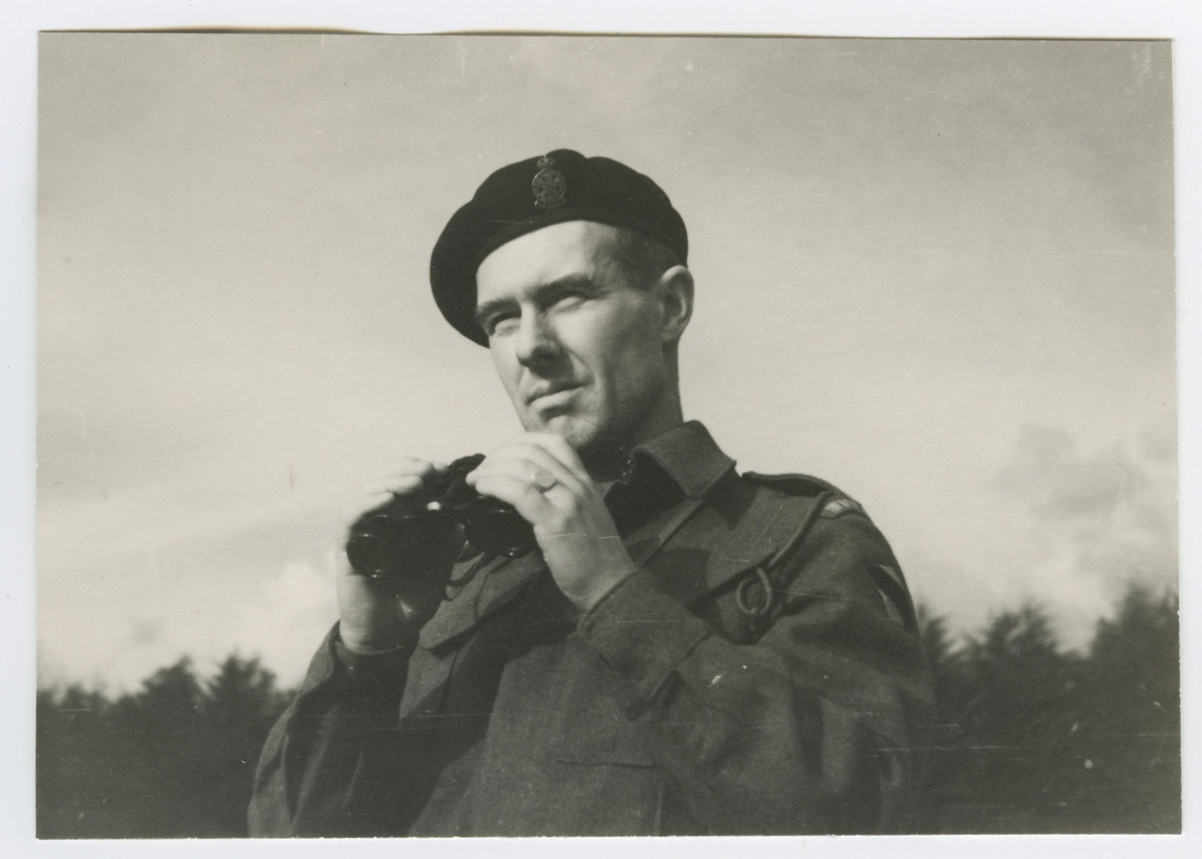 A black and white photo of Captain T. T. Arnold holding a pair of binoculars. He is wearing a battledress uniform with the Formation patch of the 1st Canadian Army Headquarters and the black beret of the Armoured Corps.