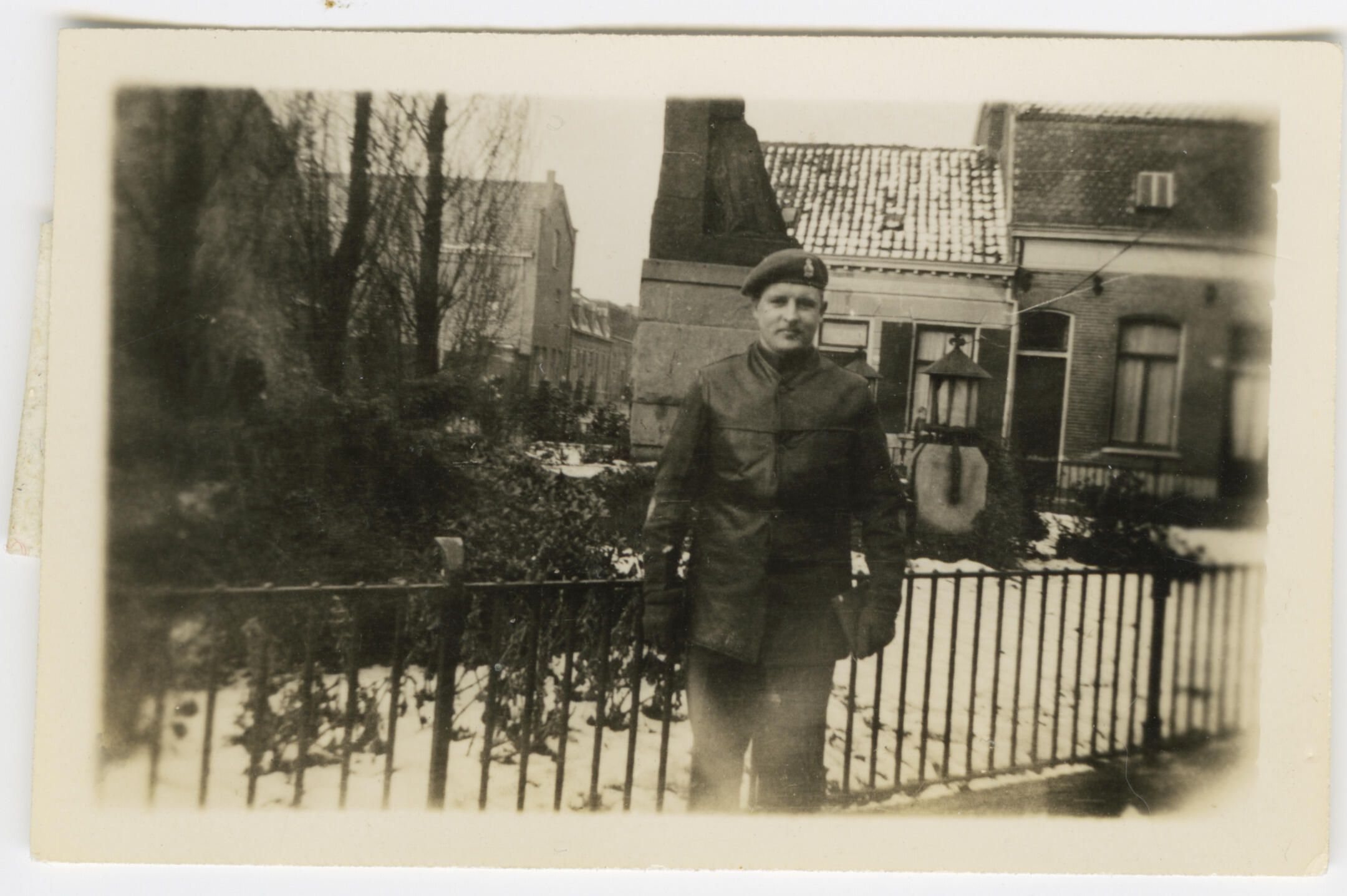 A portrait of photograph of Company Sergeant Major G. H. Quinn. He is standing near the fence of a house covered with light snow. He wearing a khaki beret and a leather jerking over his battledress uniform.Photograph Details