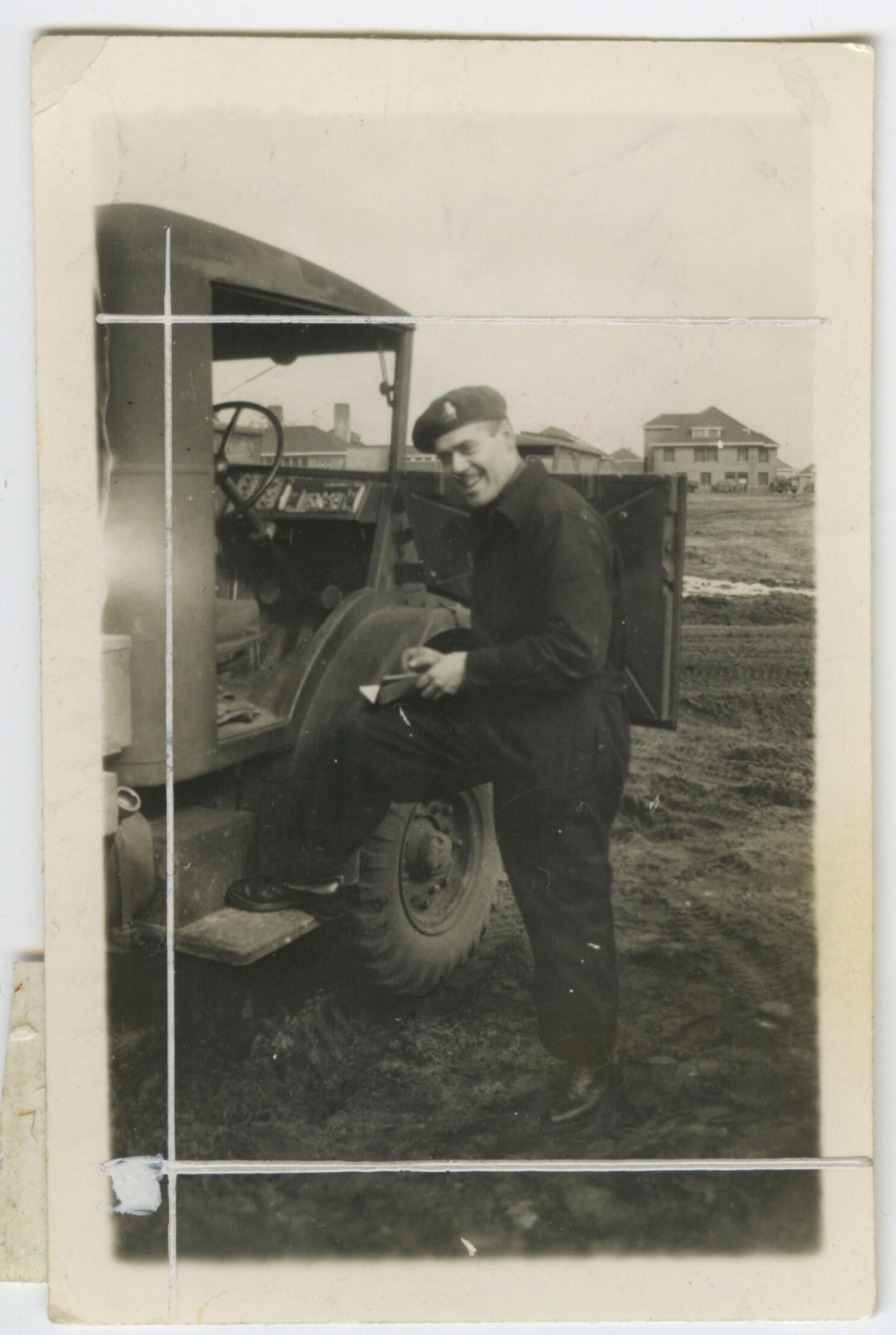 Corporal J.A. "Track" Trachy standing beside the open door of a Canadian Military Pattern truck while writing up some notes in a notebook. He is wearing black coveralls over his battledress uniform. This photo bears crop marks as it was used for inclusion in the June 1945 issue of the Regimental newsletter, The "Intercomn."Photograph Details