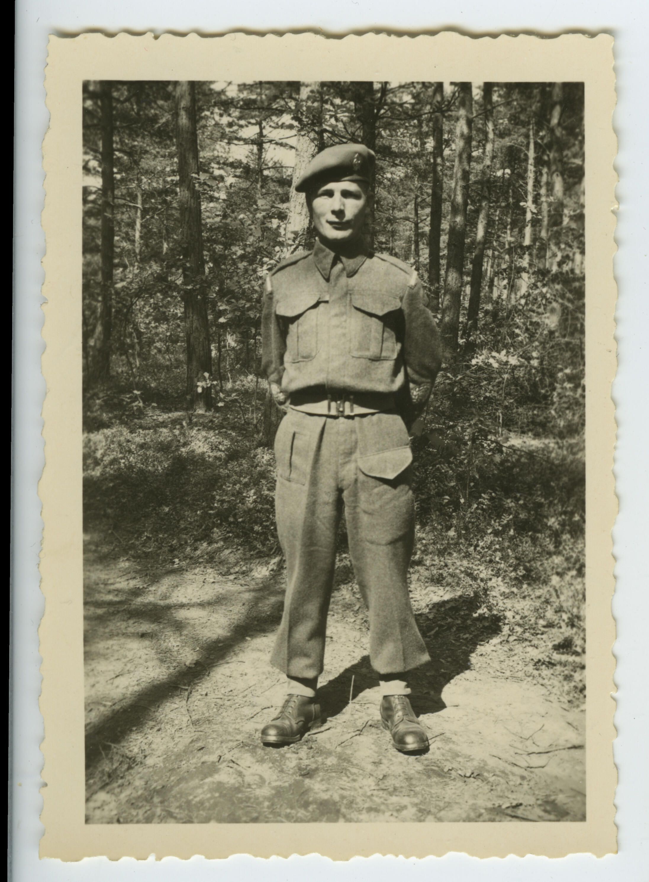 Company Sergeant Major James Byrne, part of "A" Coy, is posing in uniform with his hands behind his back while standing in front of a forest.Photograph Details