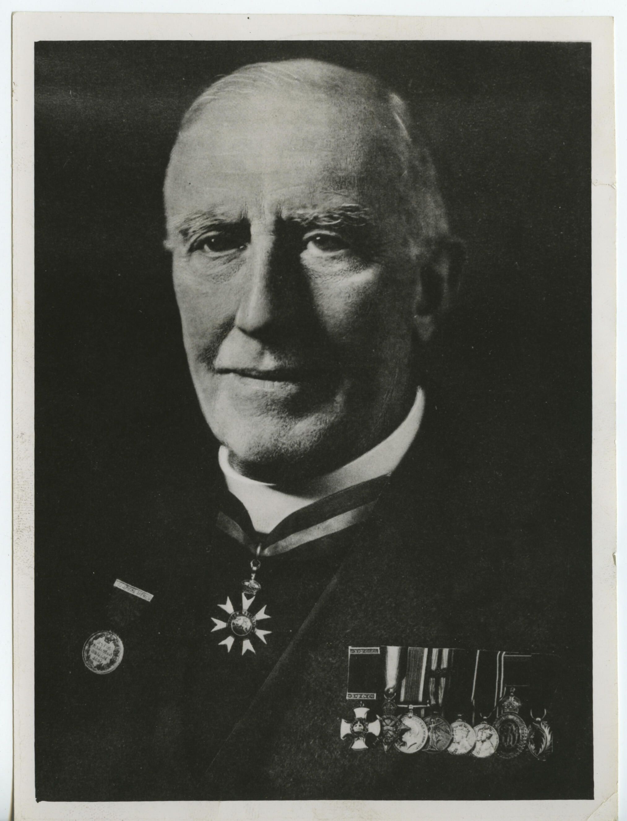 A black and white portrait of Colonel, Archdeacon Frederick George Scott, wearing his WWI service medals and decorations. Around his neck is the Companion to the Order of Saint Michael and Saint George. He also wears the Distinguished Service Order. Archdeacon Scott began his service as Padre to the 14th Battalion CEF, The Royal Montreal Regiment in August 1914.Photograph Details
