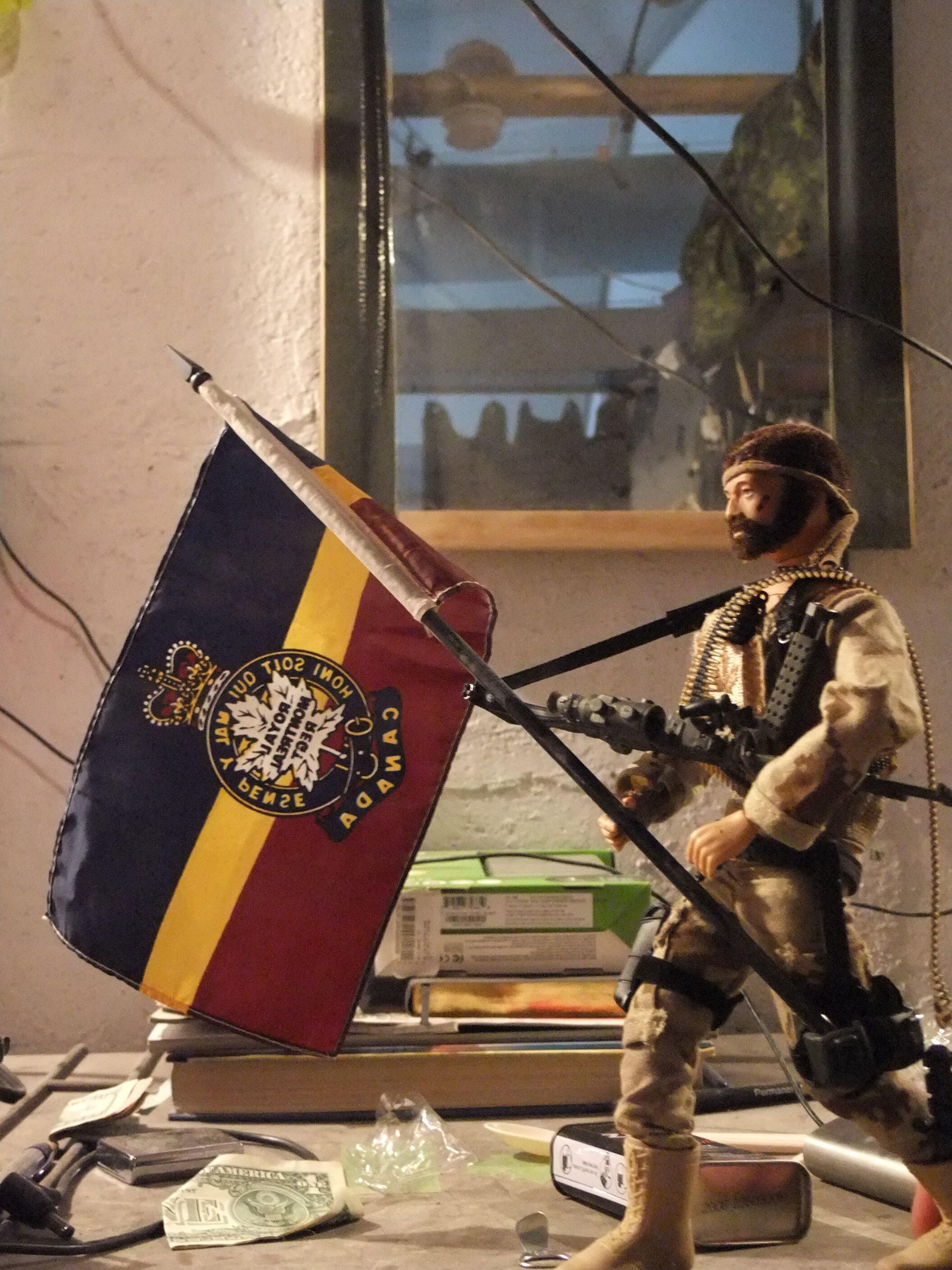 "GI Joe" holding the regimental flag of The Royal Montreal Regiment. The action figure was adopted as the unofficial mascot of the RMR Junior Ranks Club.