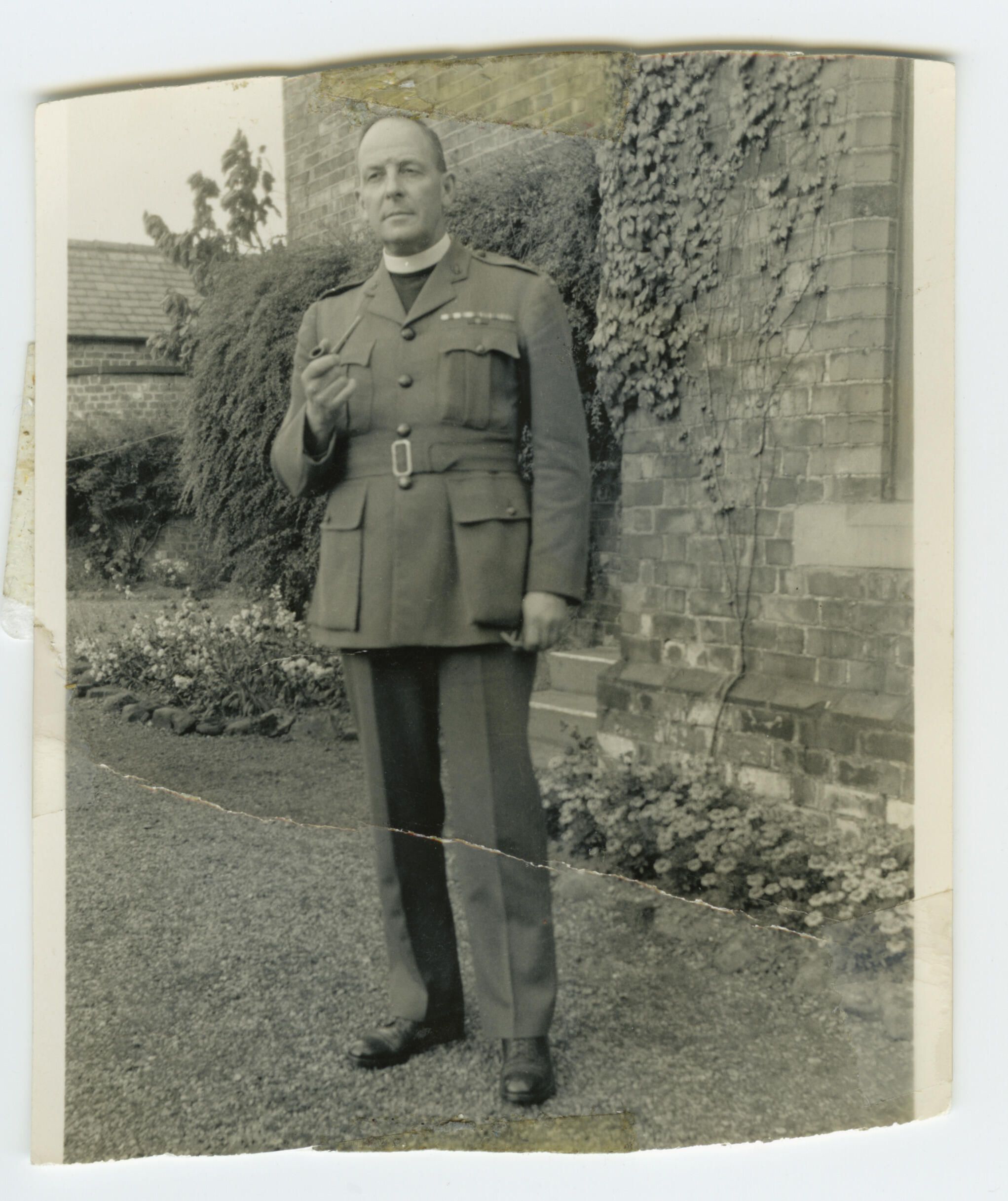A portrait photograph of Hon Major Gordon Rennie Addie acting as the Regiment's Chaplain. He is wearing his service dress uniform. The photo was taken in Yorkshire while he was on leave.Photograph Details