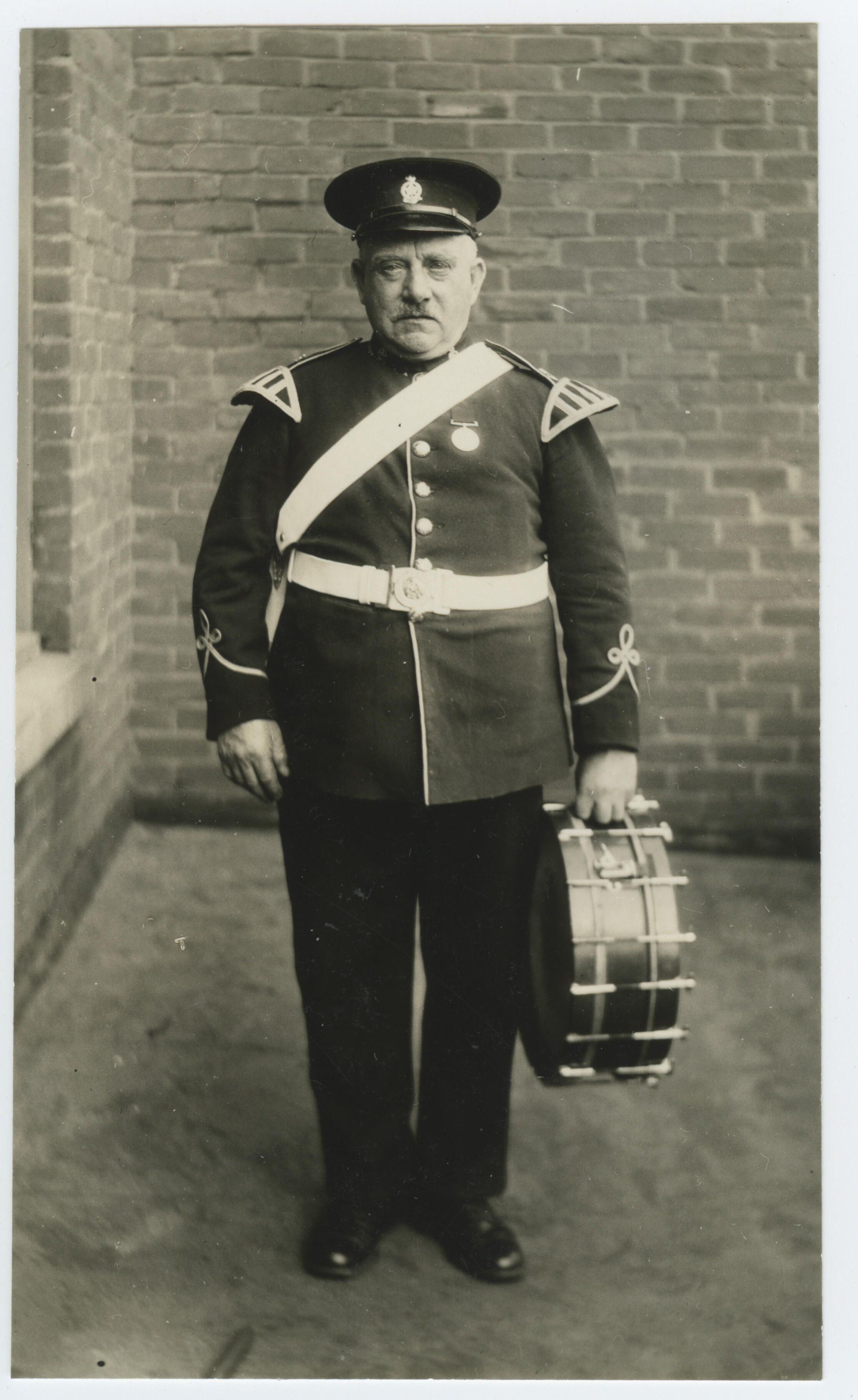 Band member, Jack Barber, is posing with a snare drum in his left hand.Photograph Details