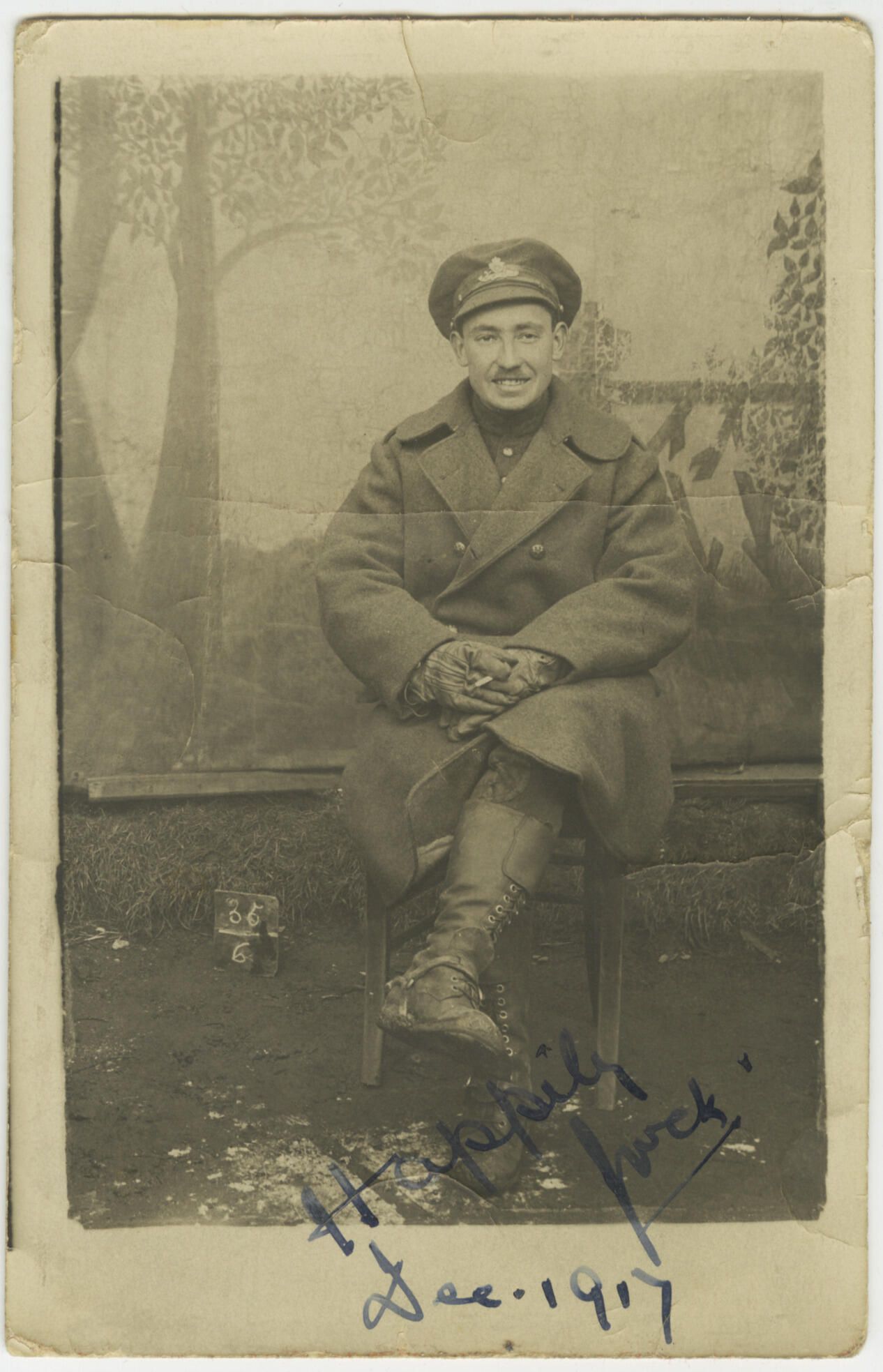 James Arthur Lawrence Noad is posing while seated with his legs crossed. He is wearing the boots and spurs of an Artillery man. He is also wearing a greatcoat, cap and gloves. His hands are folded on his lap holding a cigarette. Behind him is a painted studio background.Photograph Details