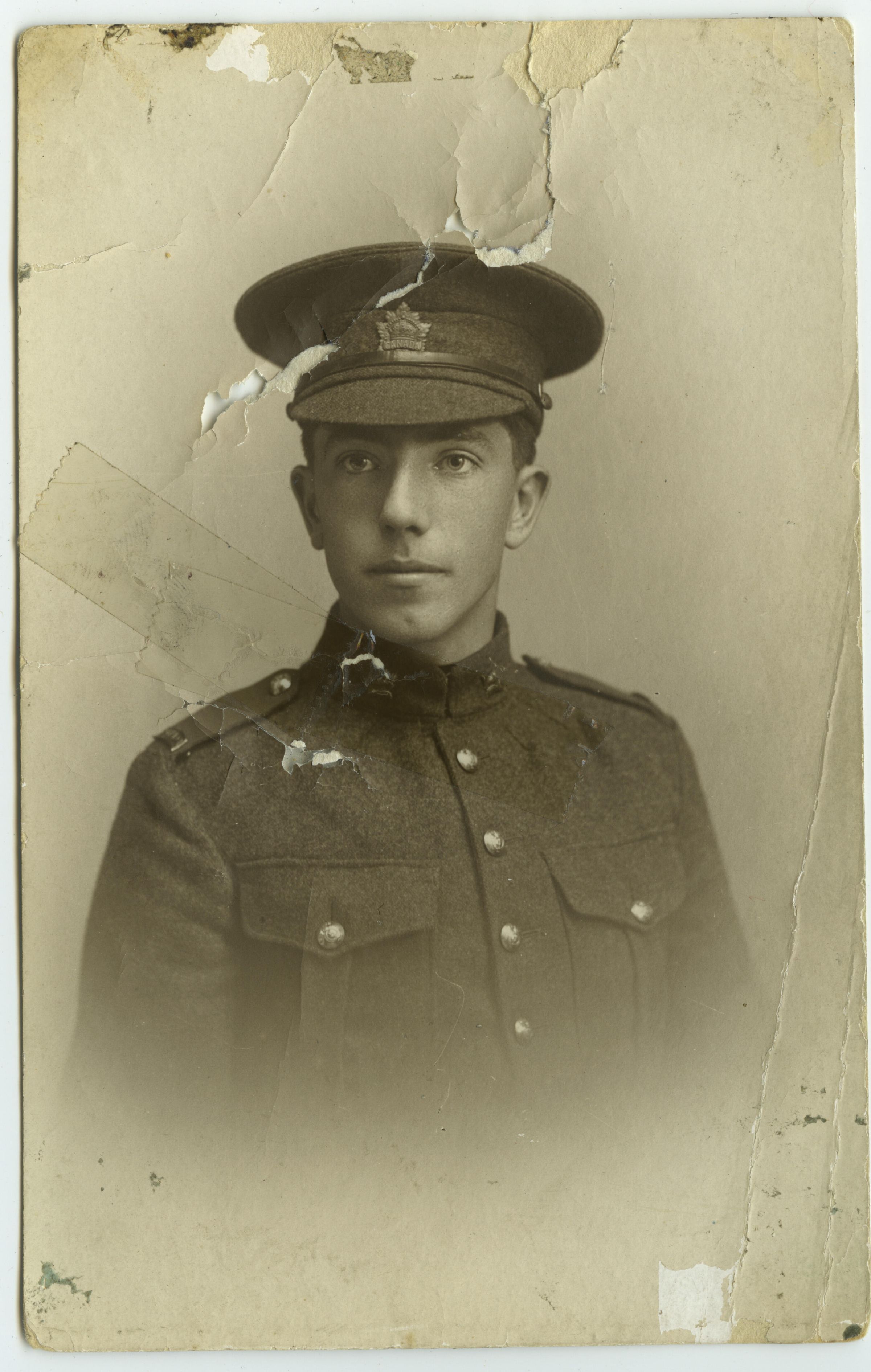 A portrait photo of Private John Fred Shirley wearing his uniform. Born in London, England he moved to Canada and enlisted in the 14th Battalion at Valcartier on September 22, 1914.Photograph Details