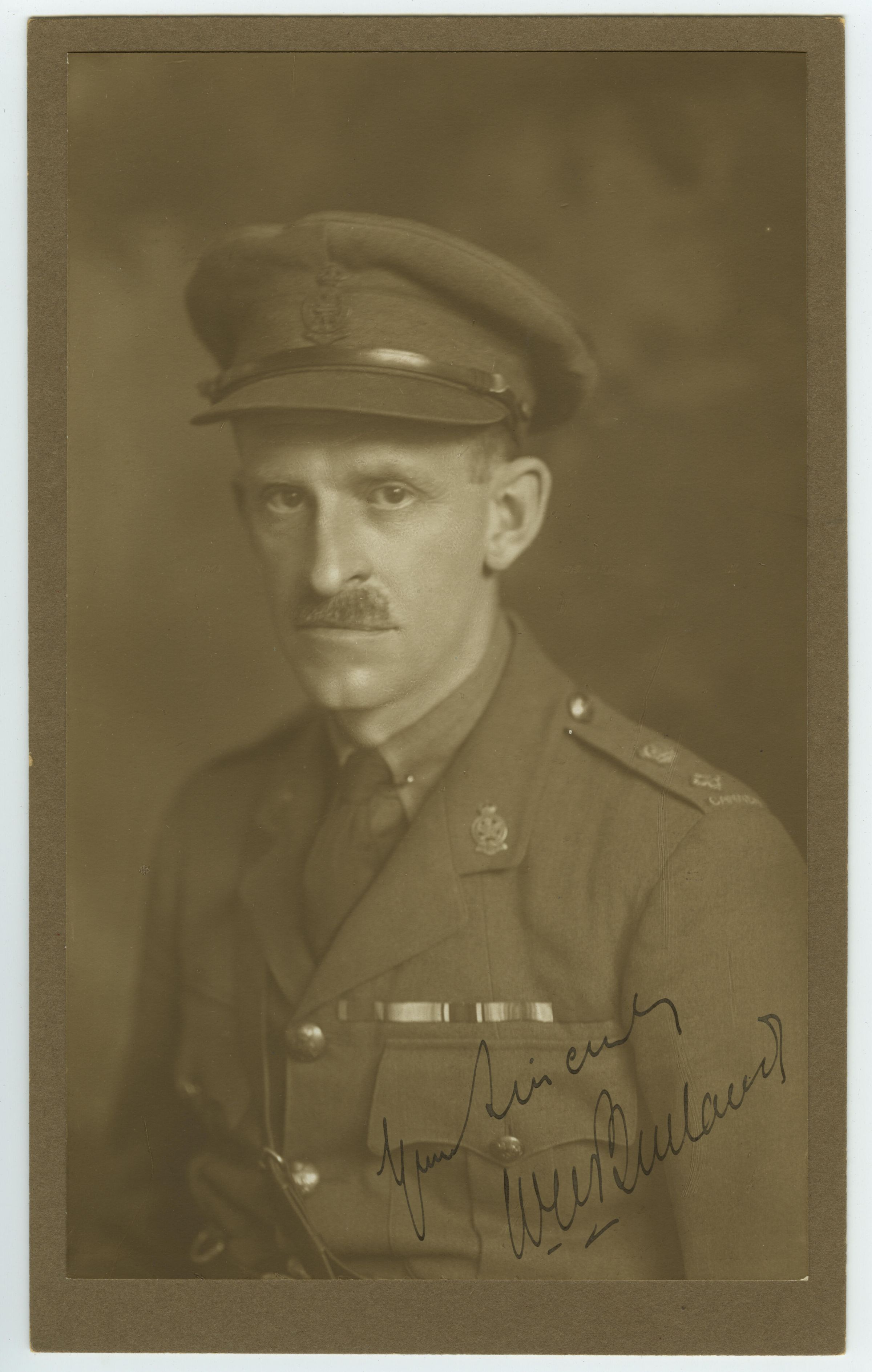 A portrait photo of Lieutenant Colonel William Watt Burland. He wears a moustache and is looking directly at the camera. He is wearing his officer uniform with The Royal Montreal Regiment cap badge and collar badges.