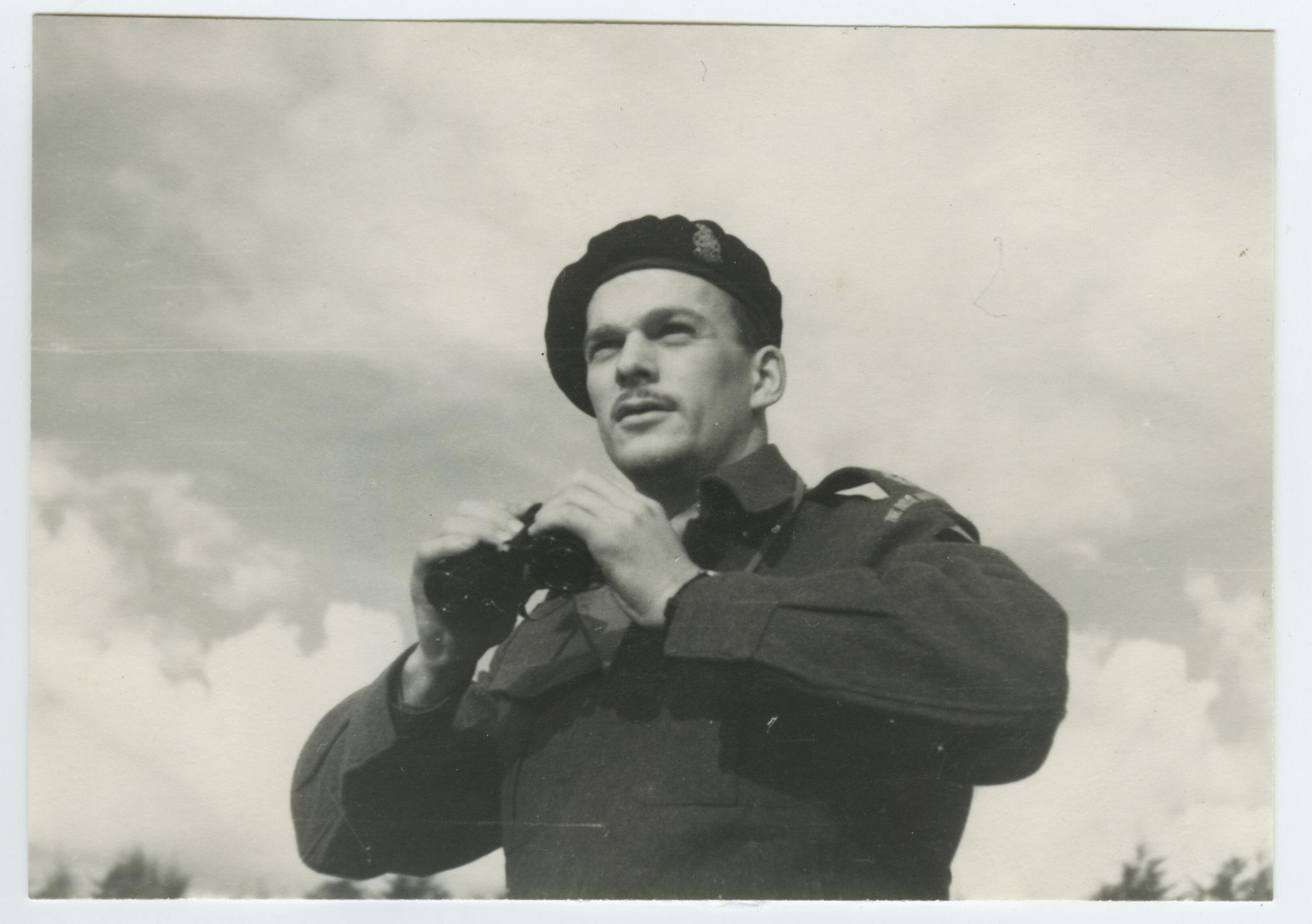 A black and white photo of Lieutenant Atlee Clarke holding a pair of binoculars. He is wearing a battledress uniform with the formation patch of the 1st Canadian Army Headquarters and the black beret of the Armoured Corps. On the verso is a newspaper clipping about his wedding to an Irish actress Miss Florence FitzSimmons of Dublin.Photograph Details