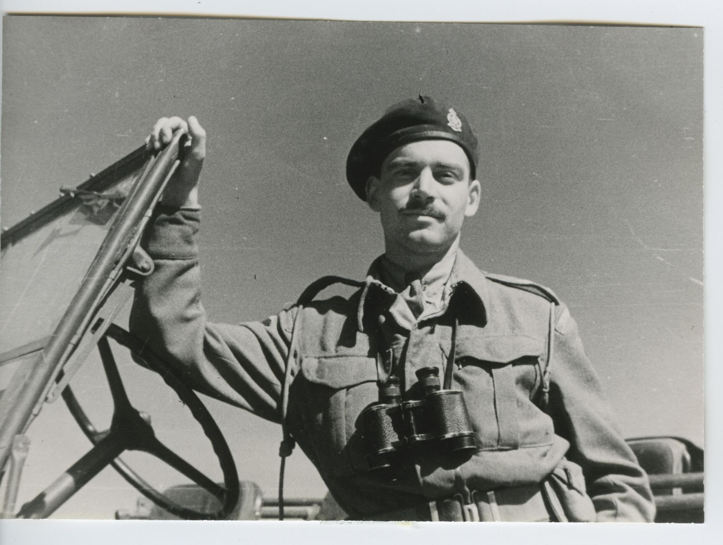A black and white photo of Lieutenant Brian Waud of the 32nd RECCE Regiment (RMR). He is wearing a battledress uniform and the black beret of the armoured corps. A pair of binoculars is hanging from his neck. He is leaning against an American built Jeep.