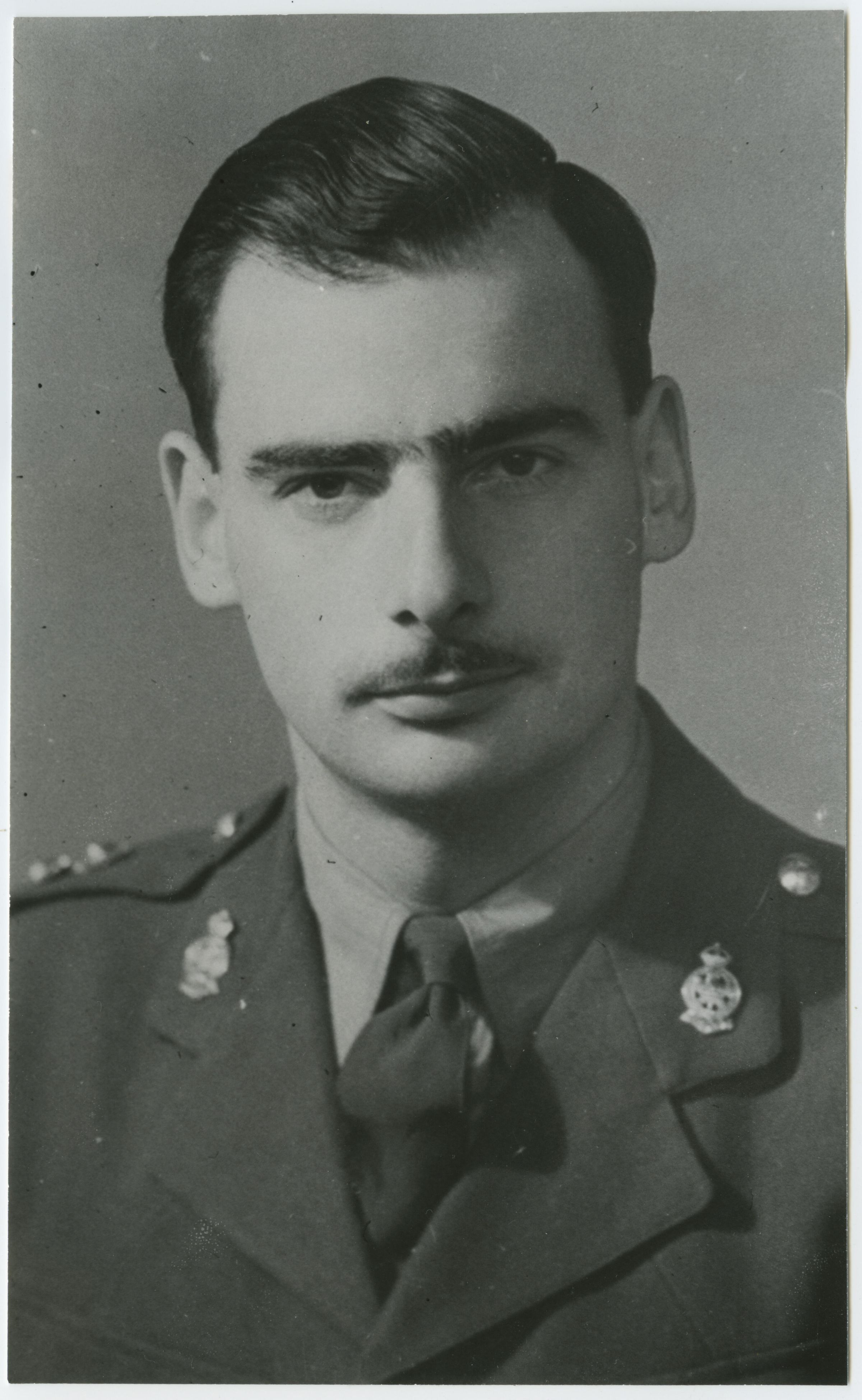 A black and white photo of Lieutenant Douglas Hunter. He is wearing the standard service dress uniform jacket. On the verso is a newspaper clipping and photos of brothers Lieutenants Lionel and Douglas Hunter who both served as officers in The Royal Montreal Regiment.Photograph Details