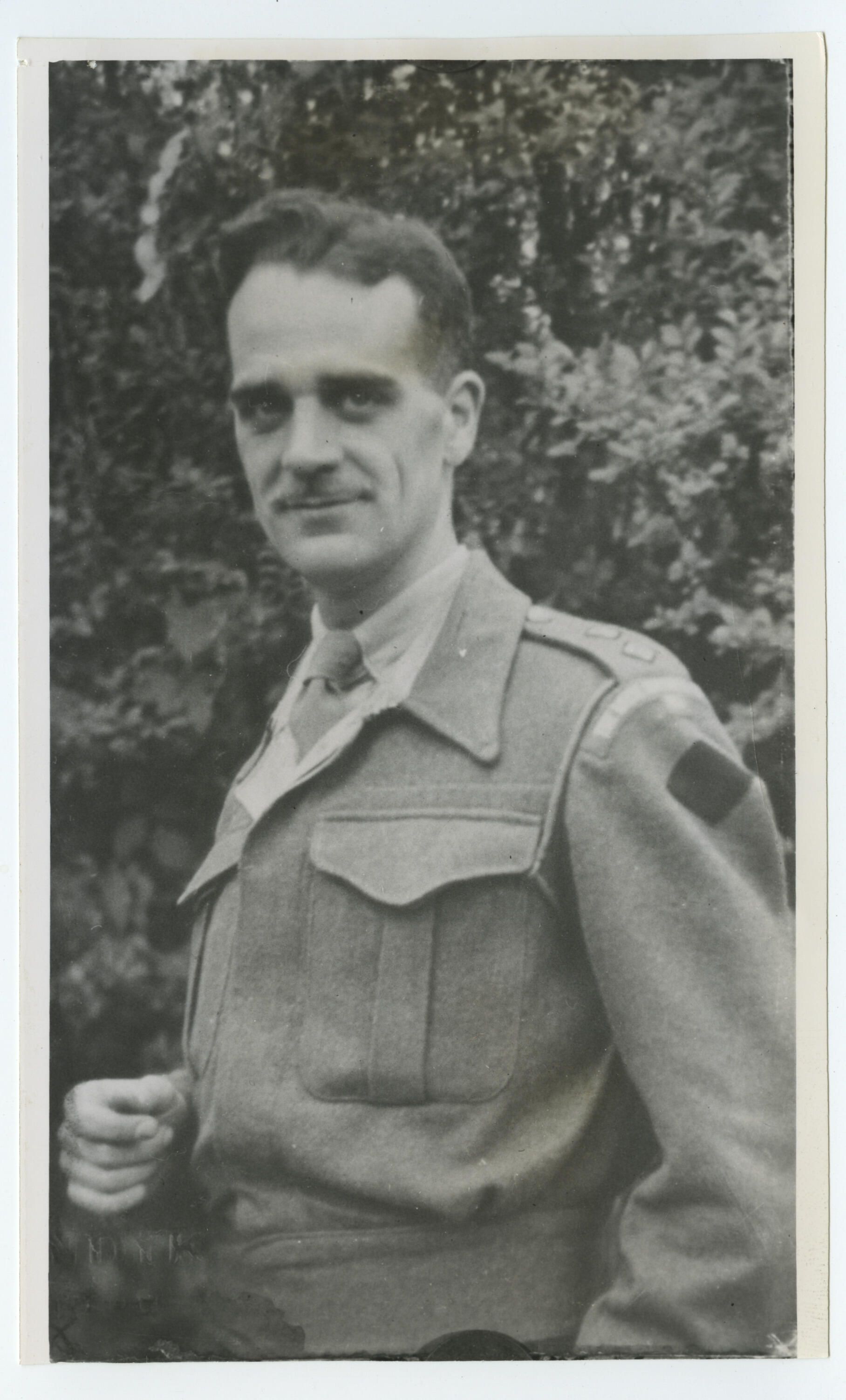 A black and white portrait photo of Lieutenant Frederick Gordon Kay of The Royal Montreal Regiment. While serving with the 8th Reconnaissance Regiment (14th Hussars) he was declared missing in action in February 1945 and died on March 24, 1945 while a Prisoner of War. He is buried in the Holten Canadian War Cemetery in the Netherlands.Photograph Details